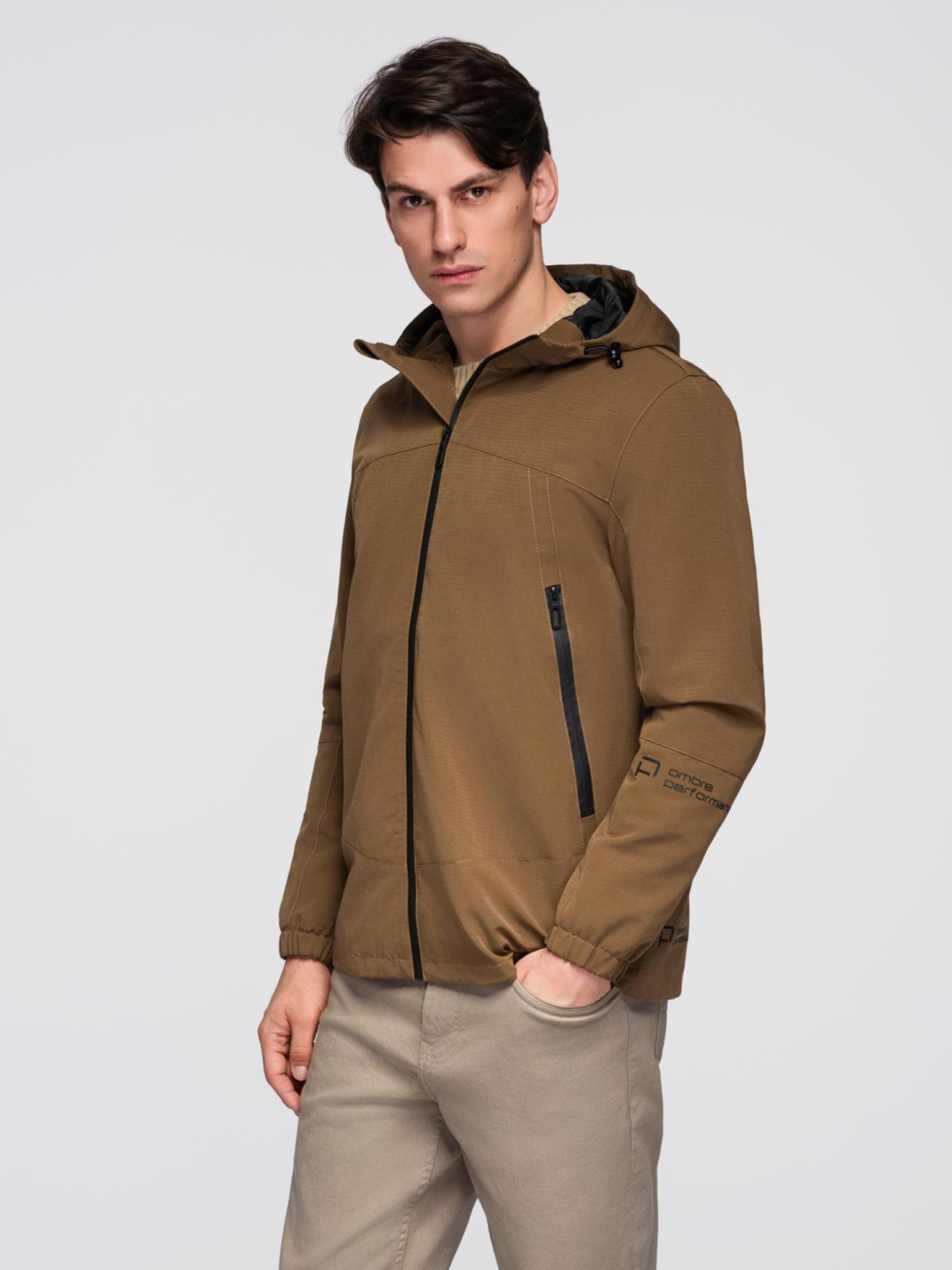 Pánska ľahká bunda regular fit s podšívkou a kapucňou - hnedo-béžová V1 OM-JANP-0242 Ombre Clothing