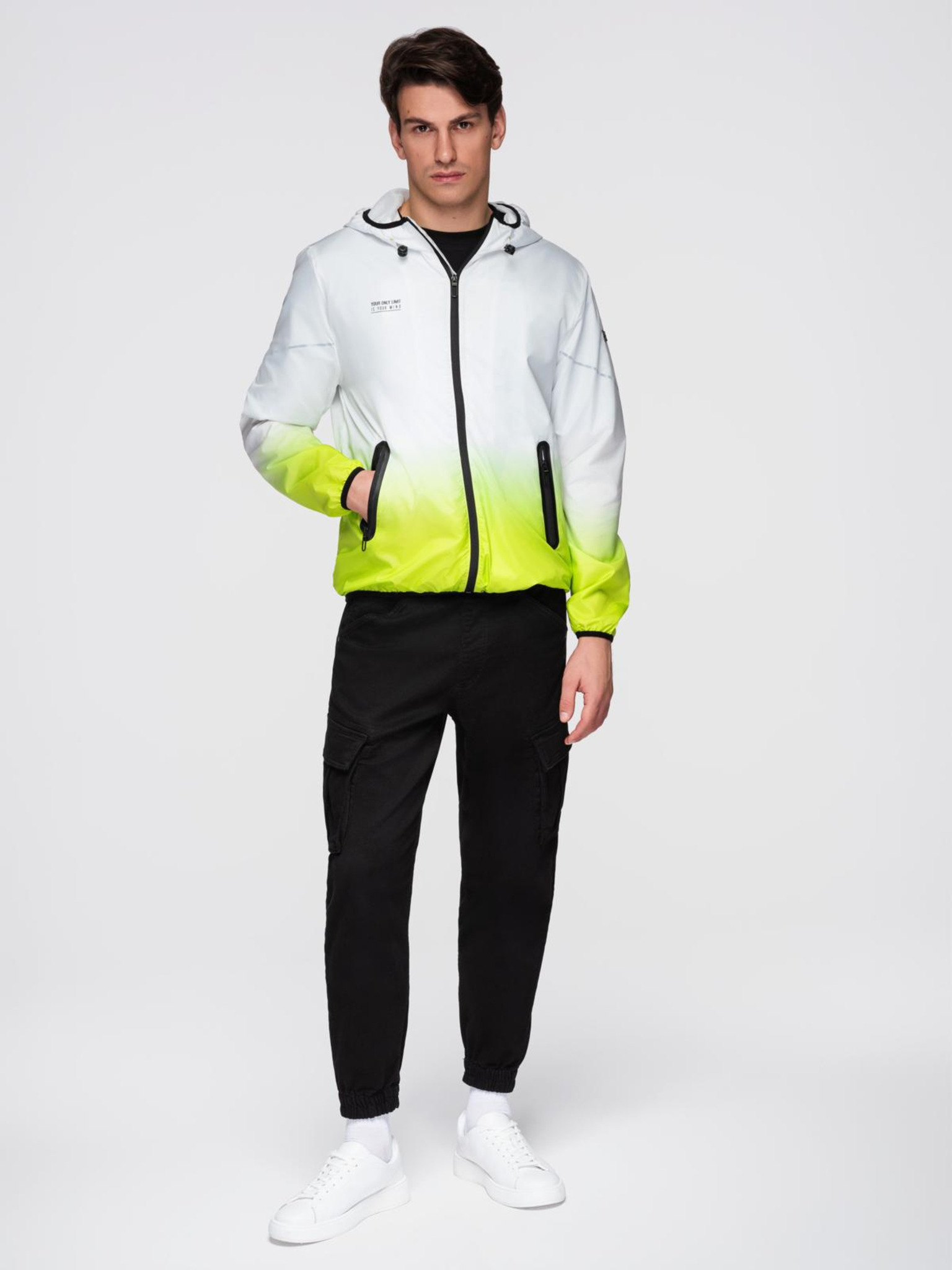 Pánska kontrastná vetrovka s kapucňou - olivovo sivá V3 OM-JANP-0228 Ombre Clothing