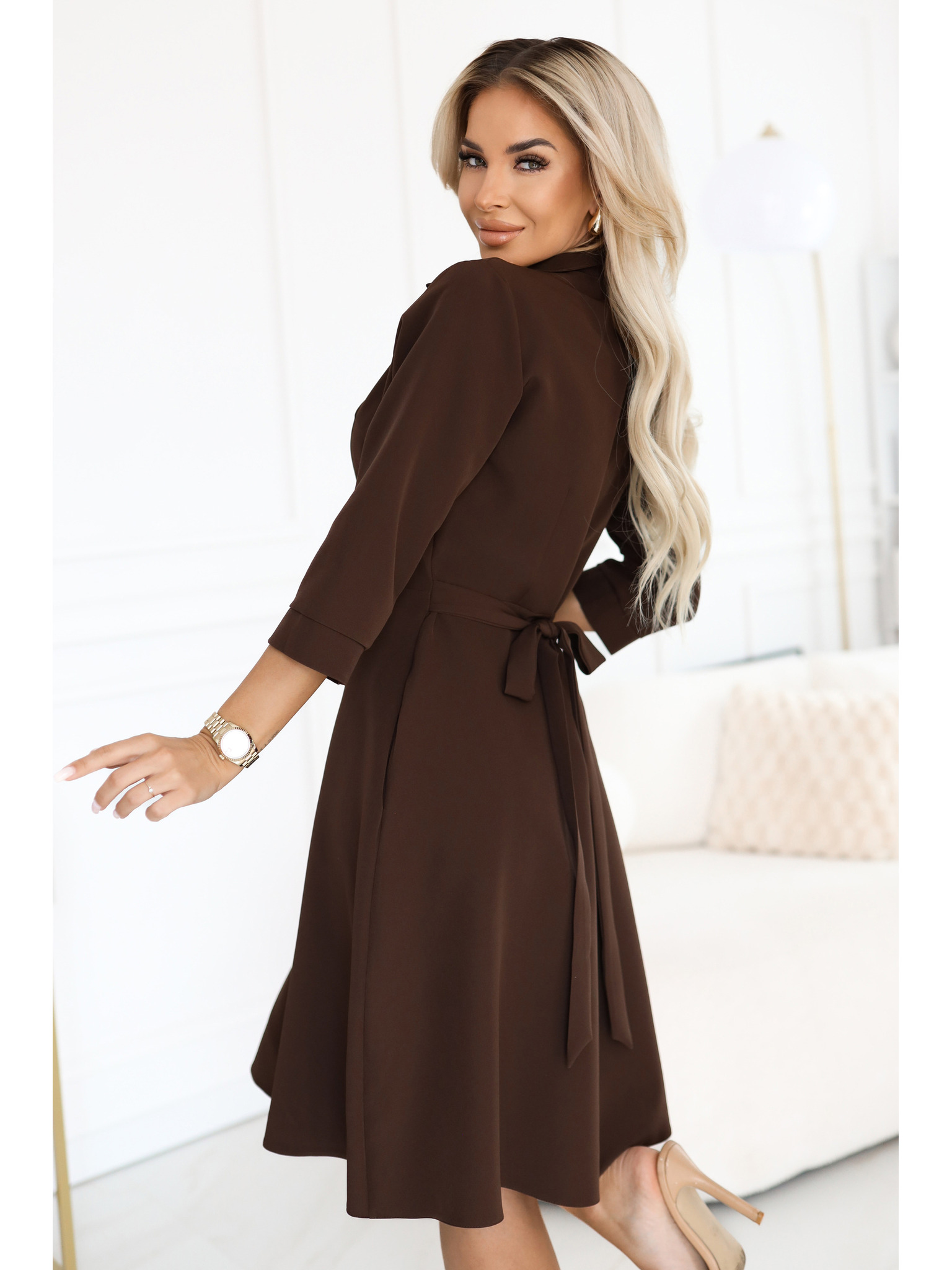 Elegantné midi košeľové šaty so zlatými gombíkmi a páskom - čokoládová farba