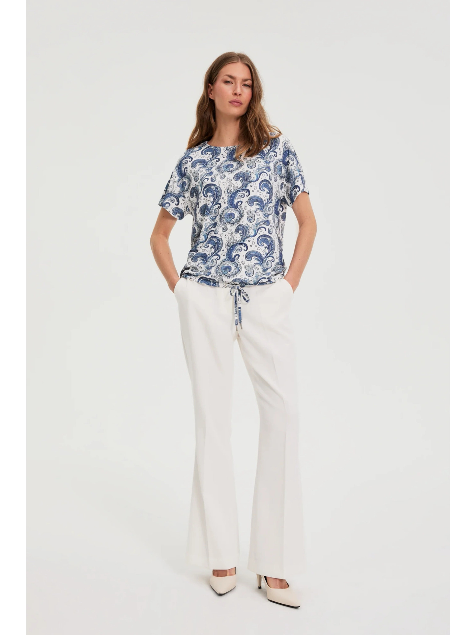 Biela a tmavmodrá blúzka s geometrickým vzorom Moodo