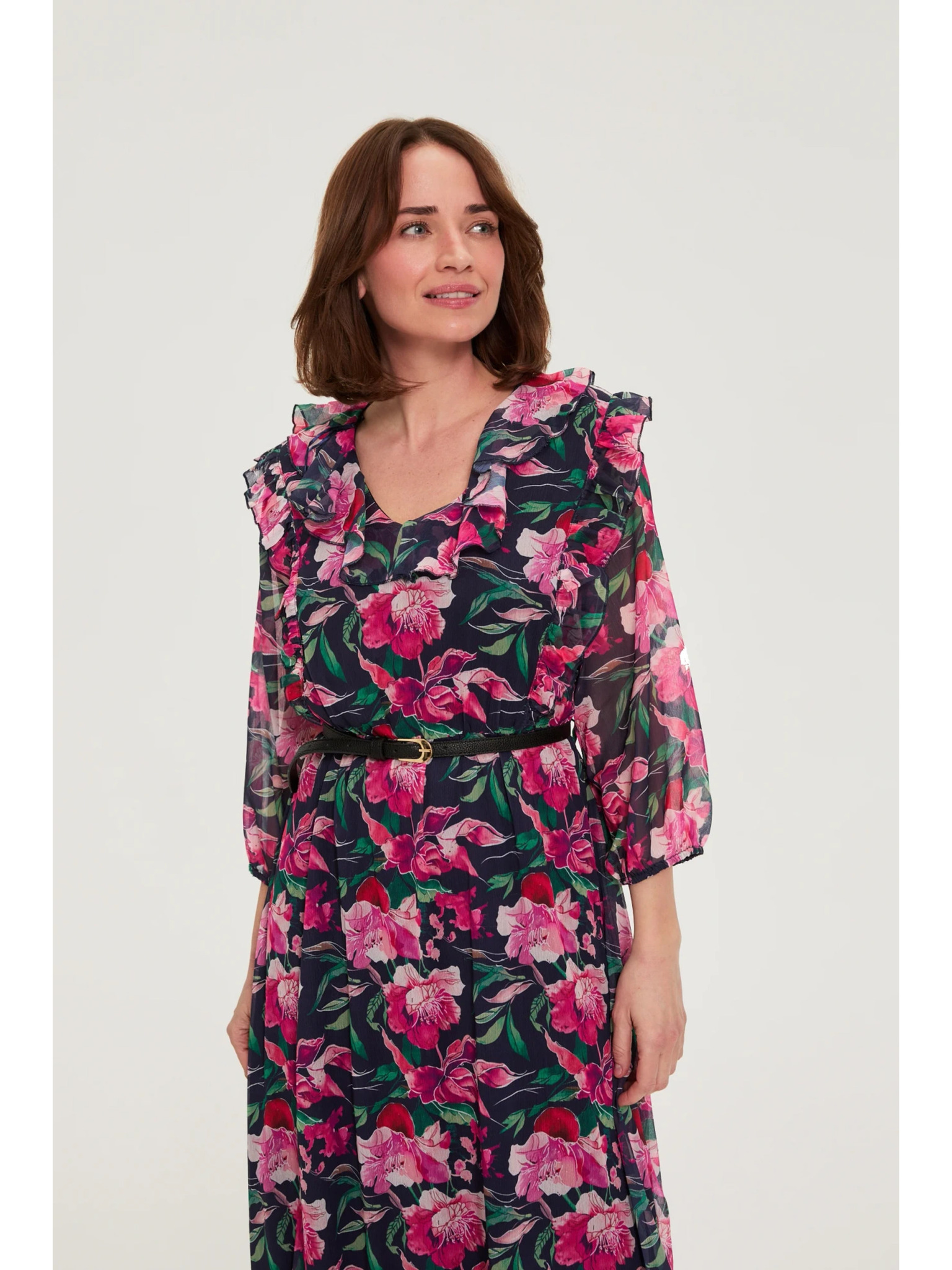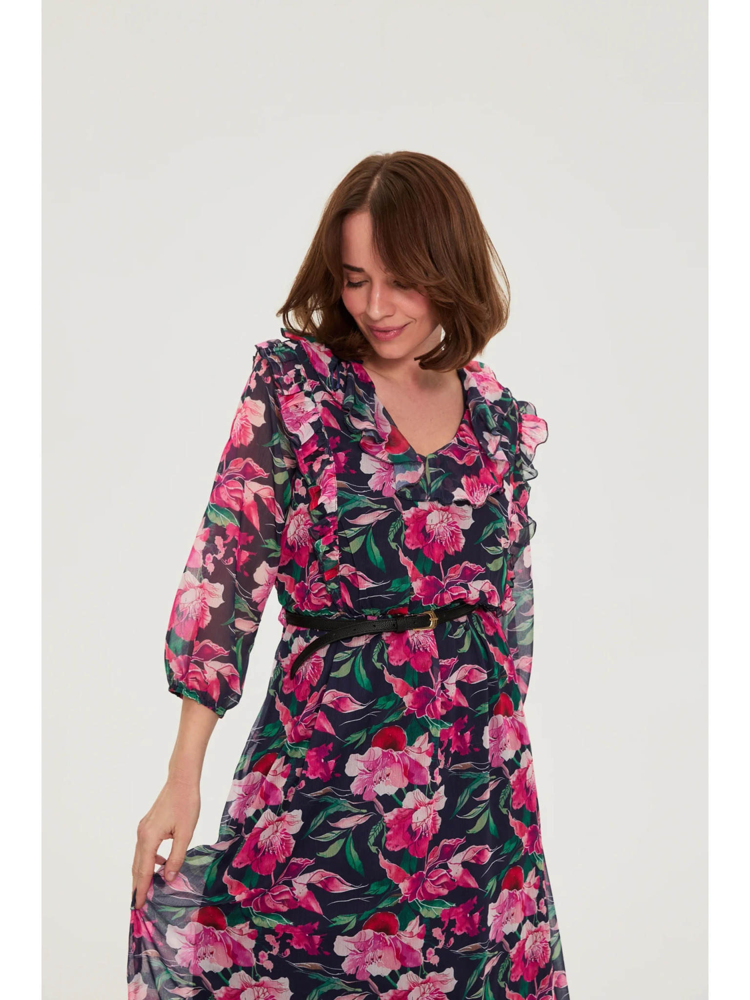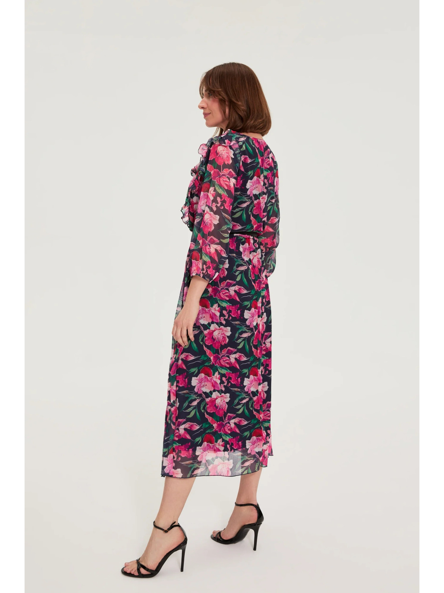 Tmavo modré midi šaty s kvetmi Moodo