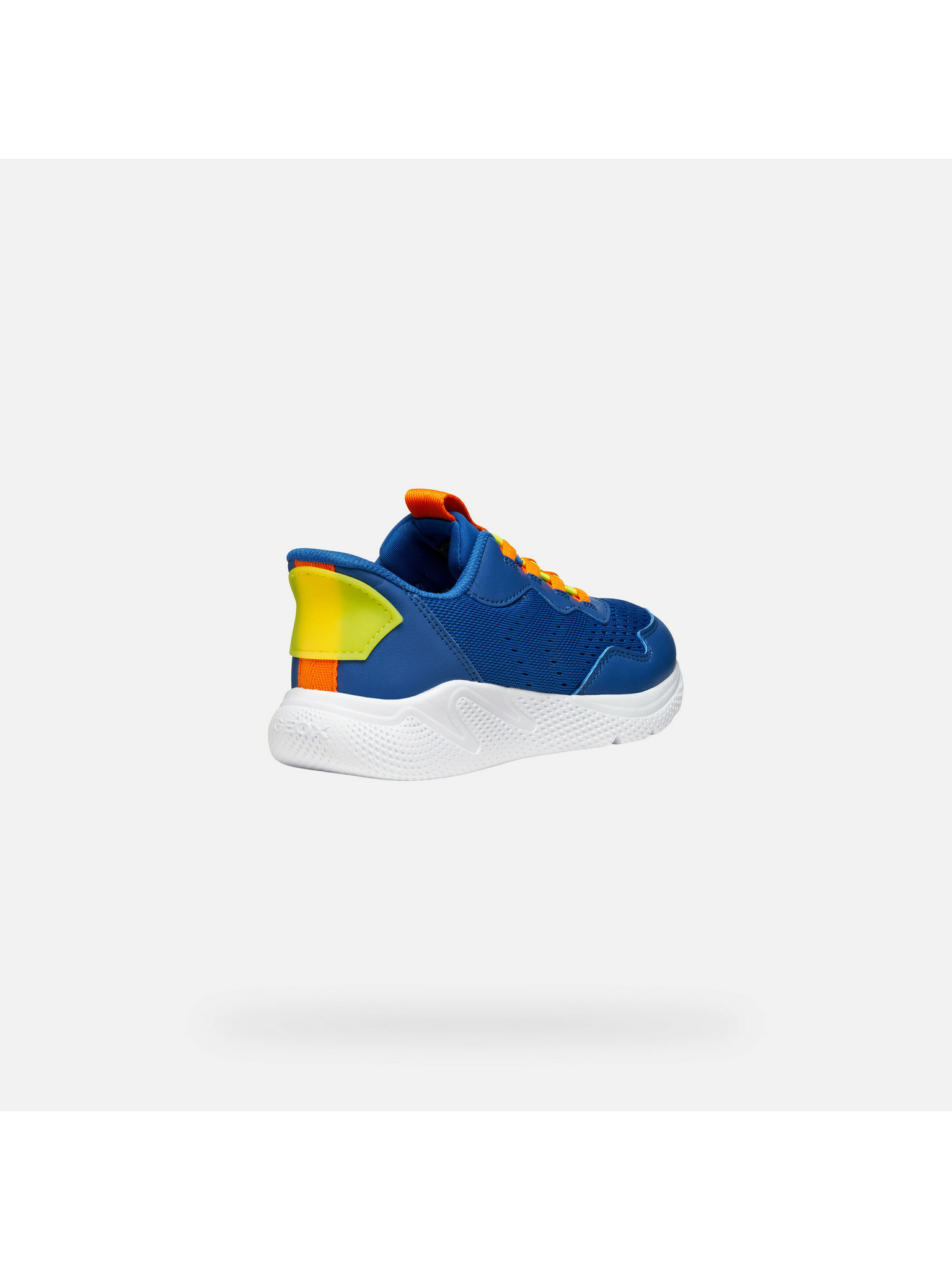 Modré chlapecké tenisky Geox Sprintye zaujmou svým sportovním designem s výraznými oranžovými tkaničkami, žlutými průchodkami a zeleno-žlutým akcentem na patě. Prodyšný svršek s perforací a texturovaná bílá podrážka s vlnitým vzorem zajišťují pohodlí při každém kroku.