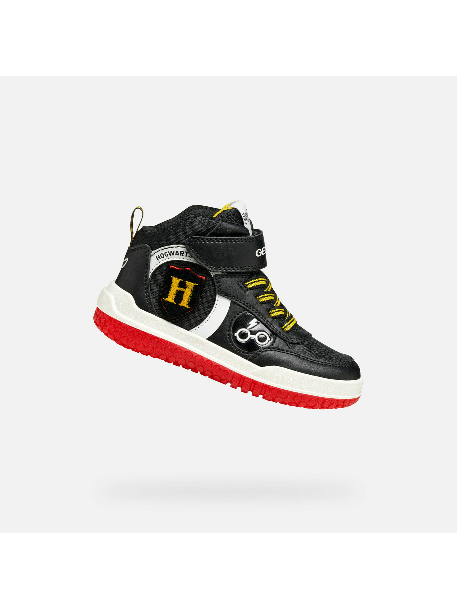 Čierne chlapčenské tenisky Geox Buzzerlight inšpirované svetom Harry Pottera s vysokým členkom a magickými detailmi.