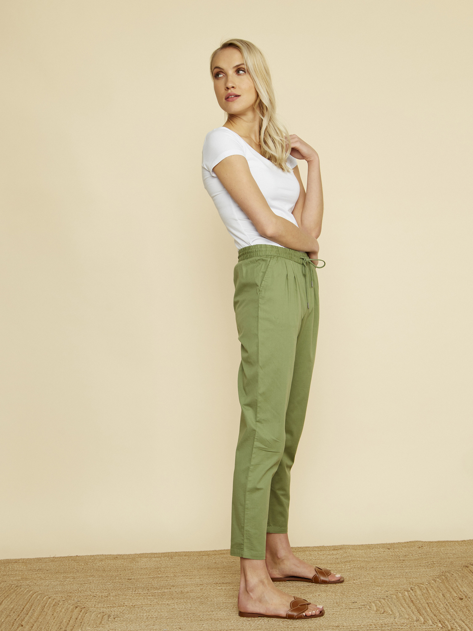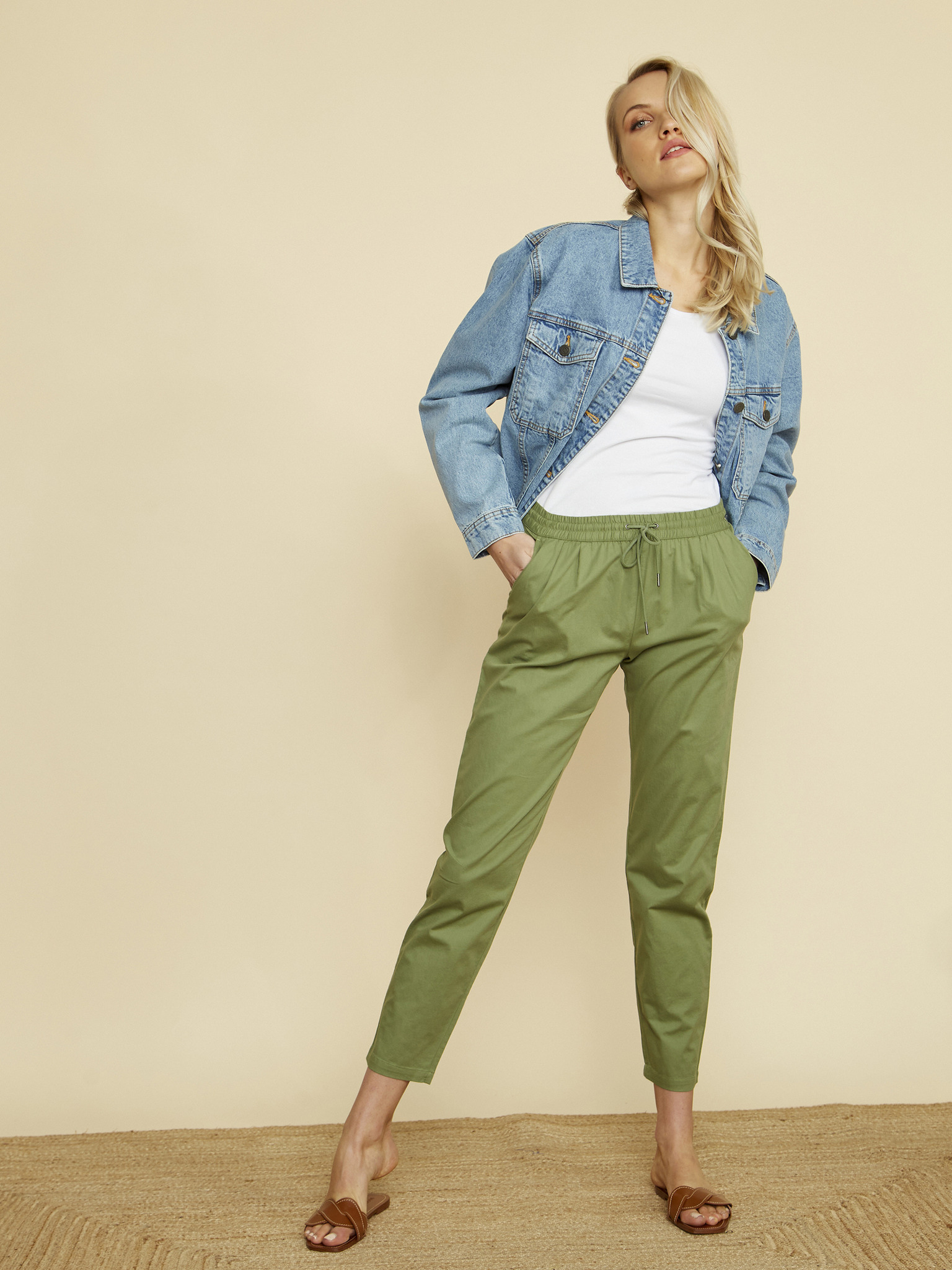 Olivové nohavice so širokým strihom a gumou v páse Moodo