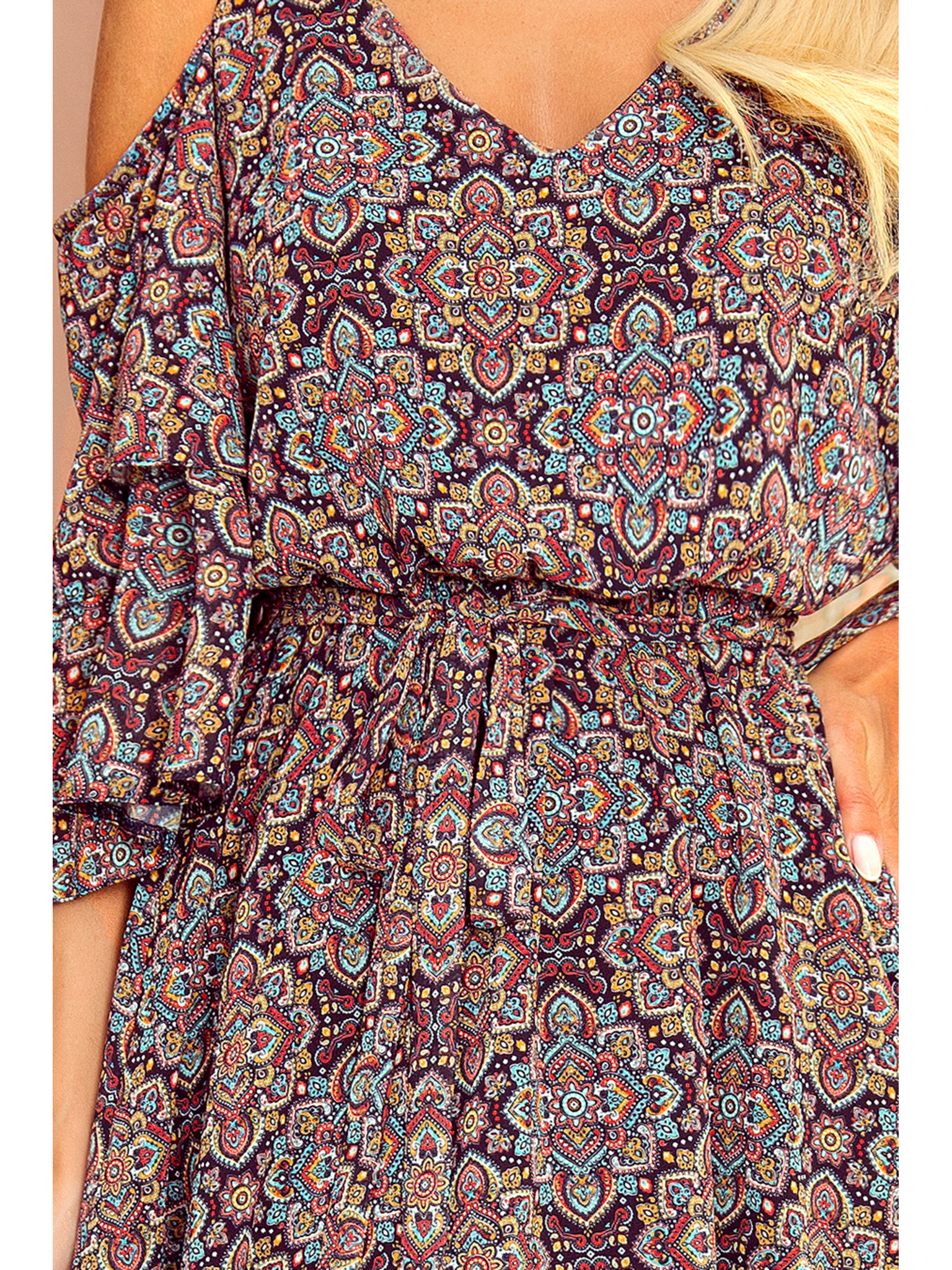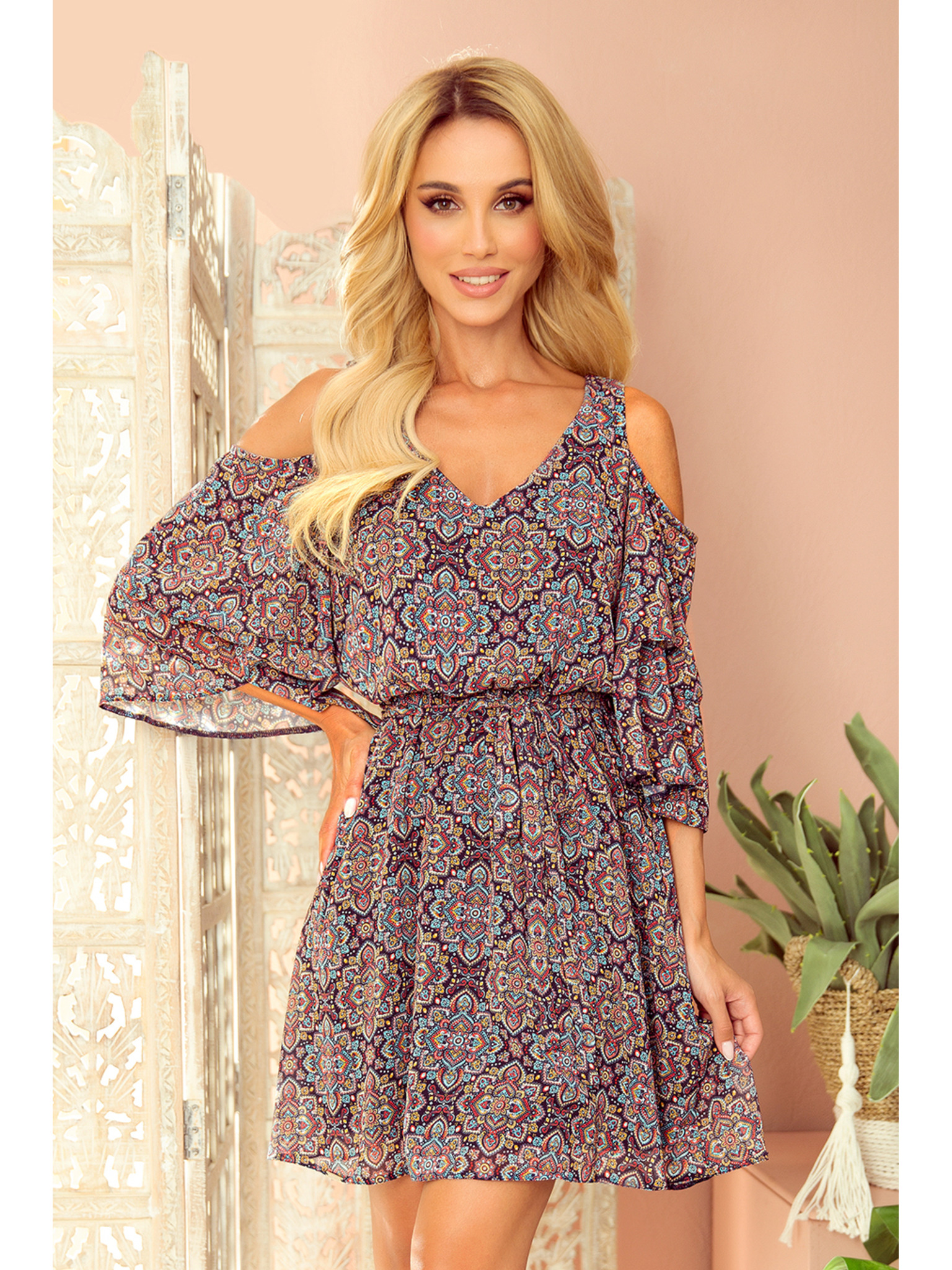 296-13 VICTORIA Boho šaty s trapézovým vzorom a stredomorskou potlačou