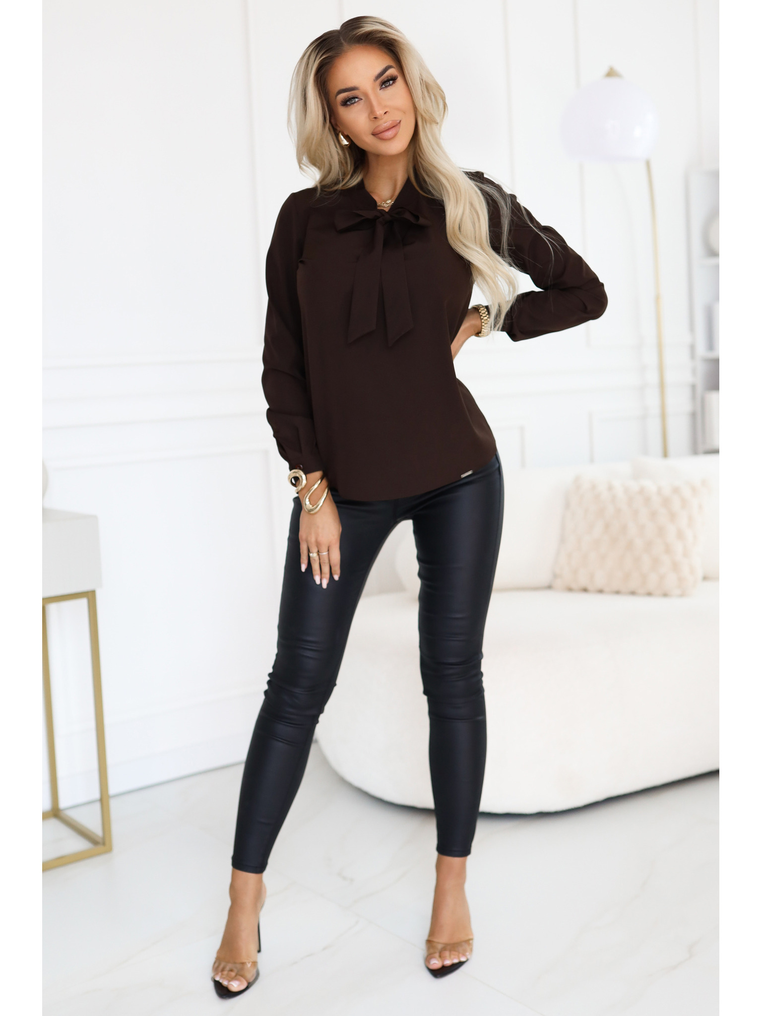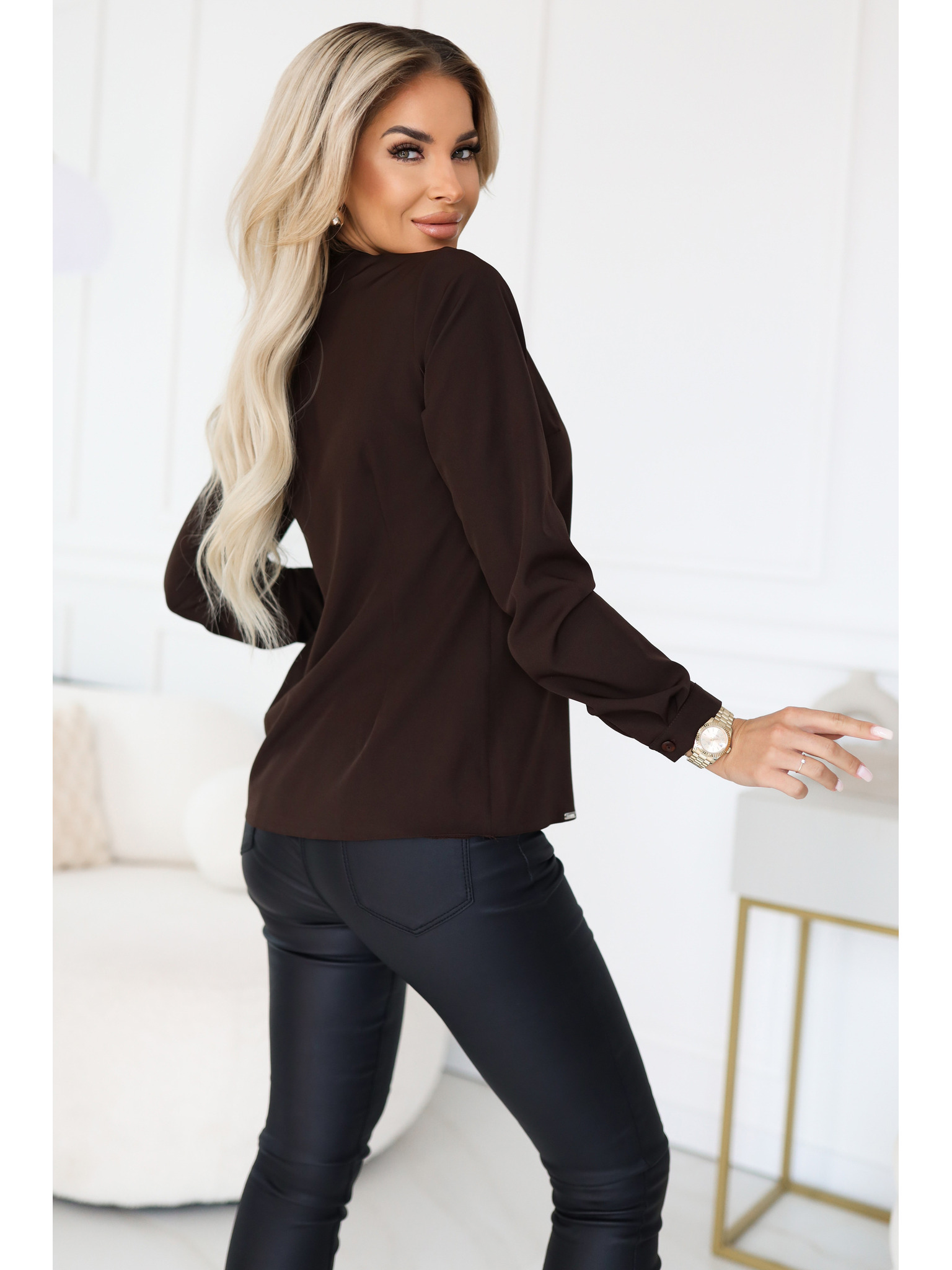 Hnedá dámska blúzka s dlhým rukávom so zaväzovaním a gombíkmi Numoco