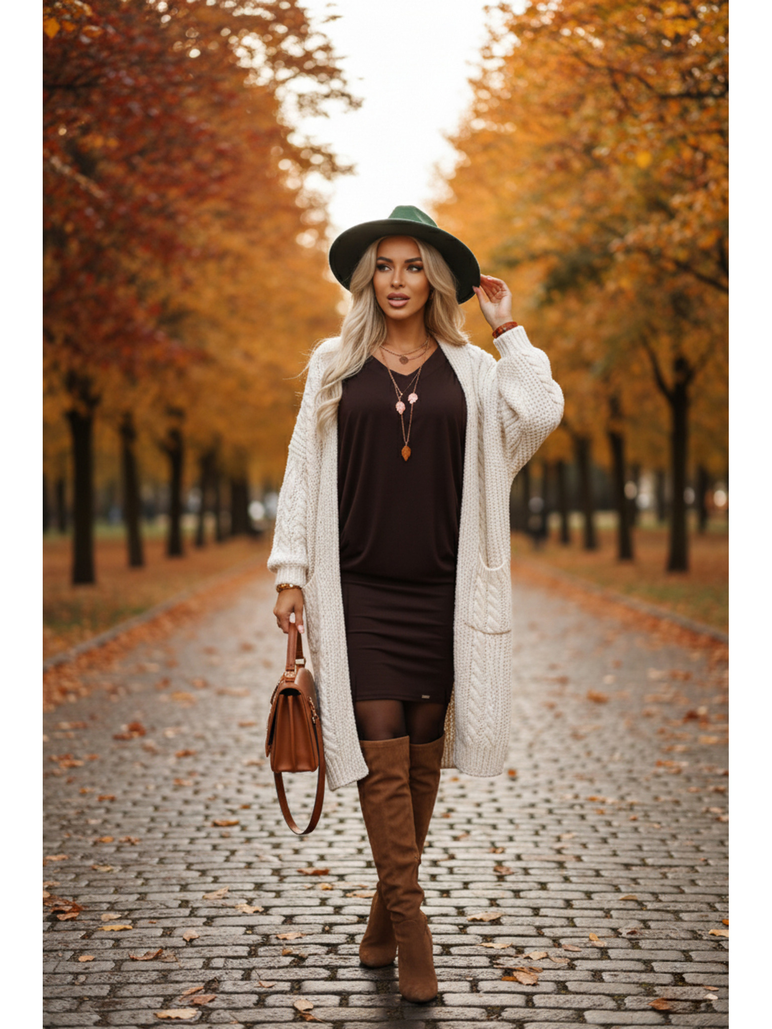 IVANA pohodlné trapézové šaty s výstrihom a dlhým rukávom - čokoládové