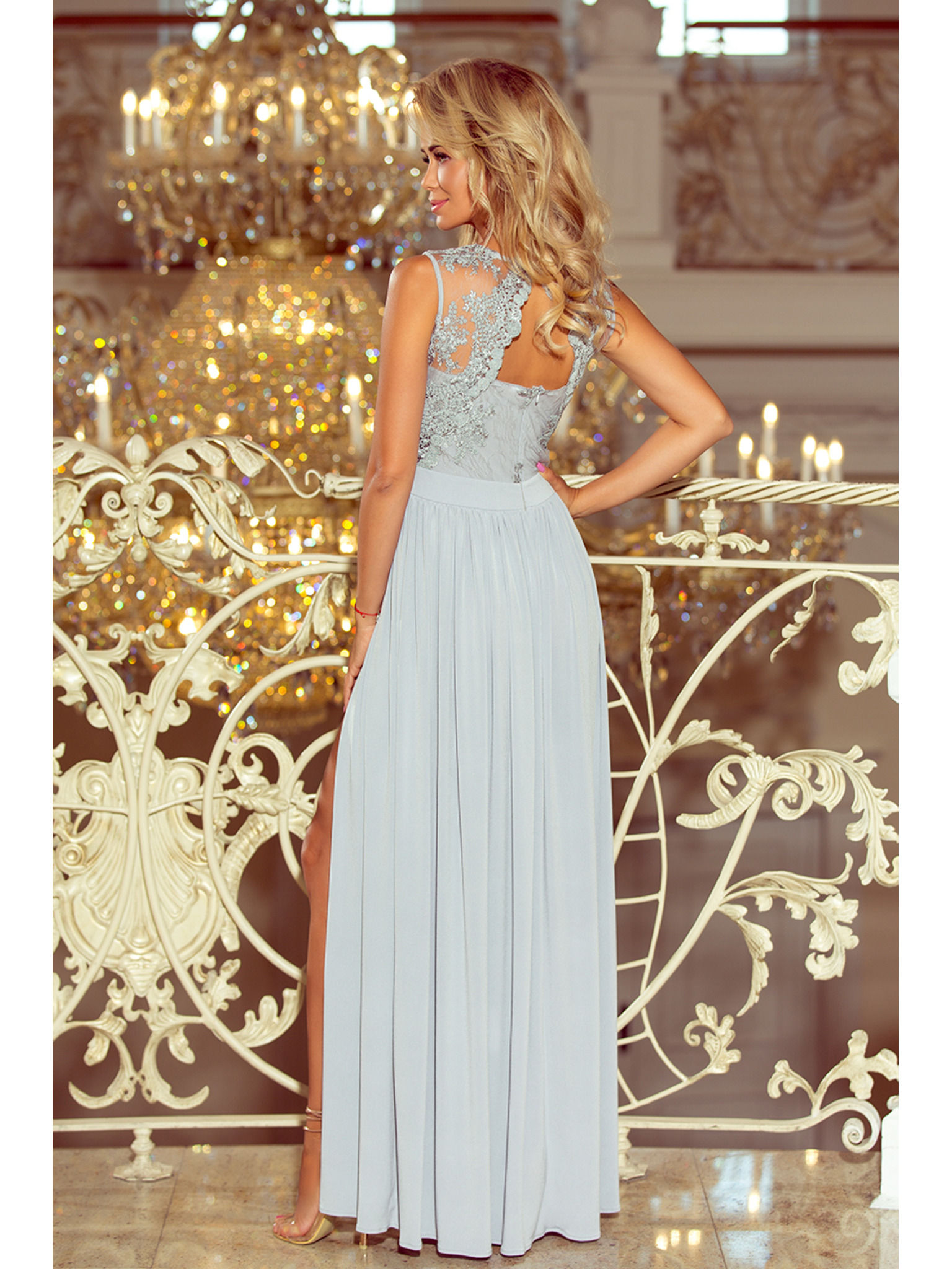AMBER čipkované, elegantné dlhé šaty s výstrihom a rozparkom pri nohaviciach - čierne