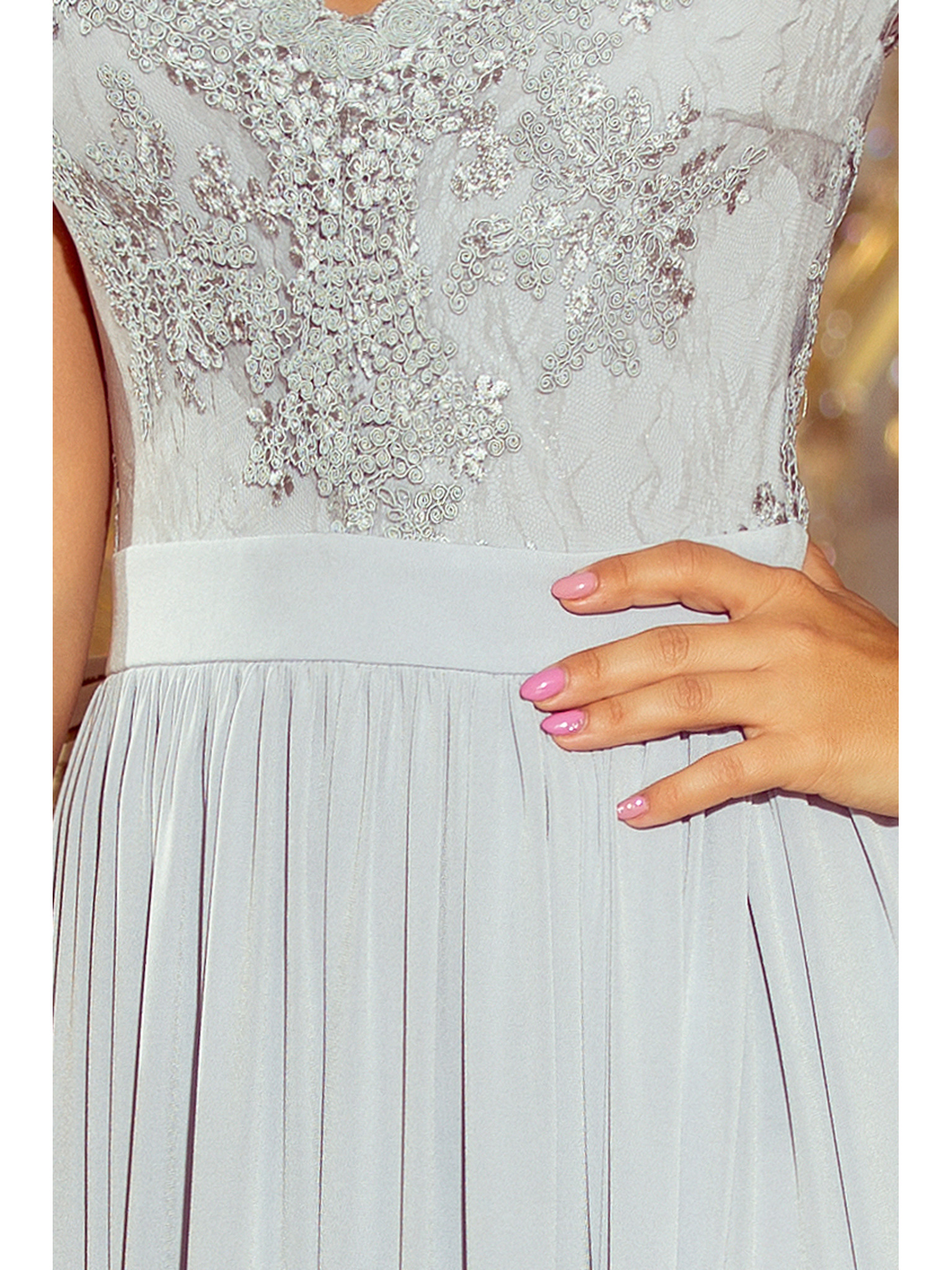 AURELIA dlhé šaty s rozparkom a diamantovým výstrihom - béžové s trblietkami