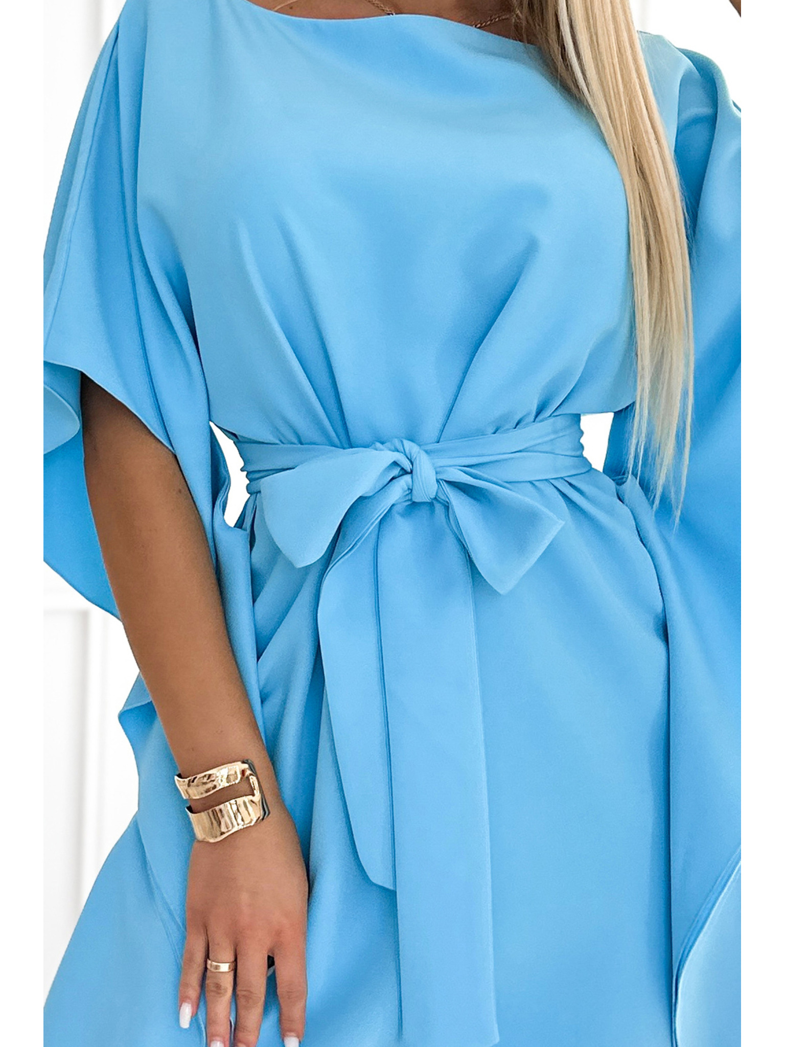 Šaty s dlhým rukávom a skladaným výstrihom - svetlomodré Numoco ISABELLE
