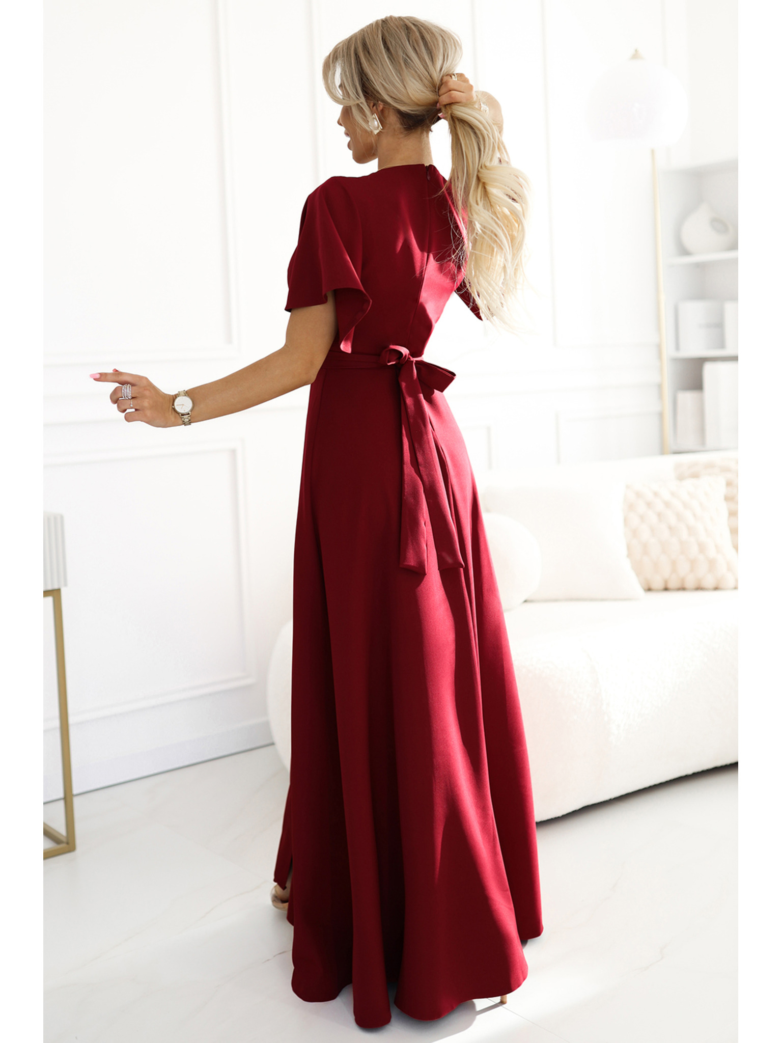 Dlhé šaty LEA s čipkovým výstrihom a rozparkom - vínovej farby