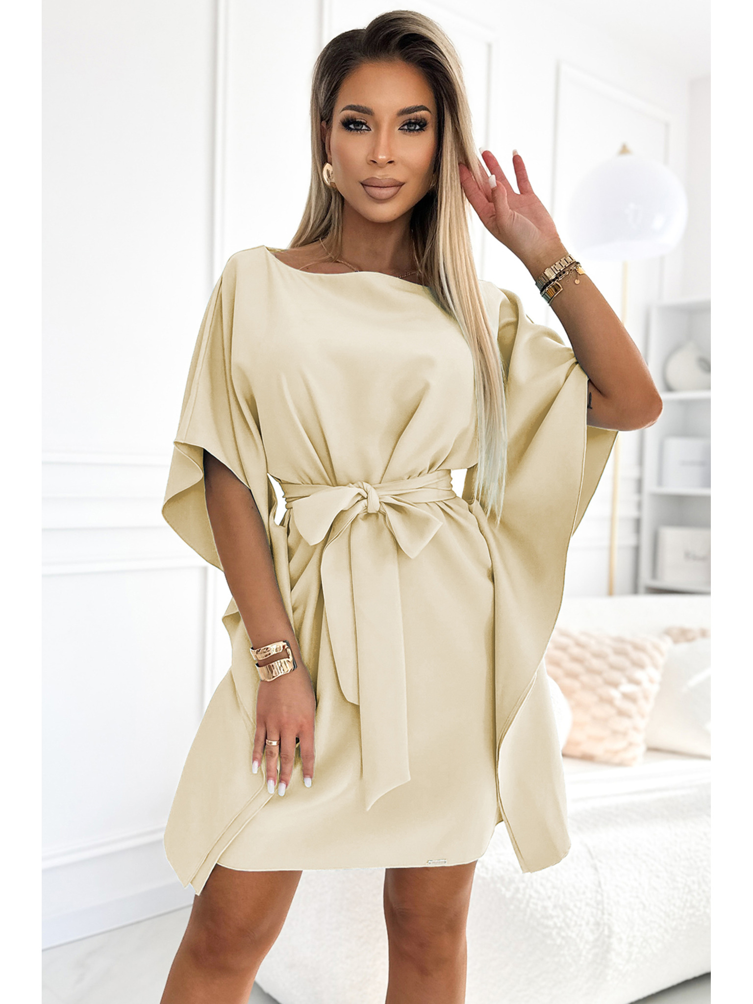 Lesklé šaty s krátkym rukávom, výstrihom a rozparkom na nohách - béžové s trblietkami Numoco