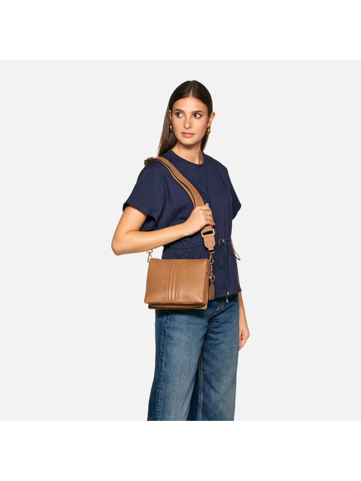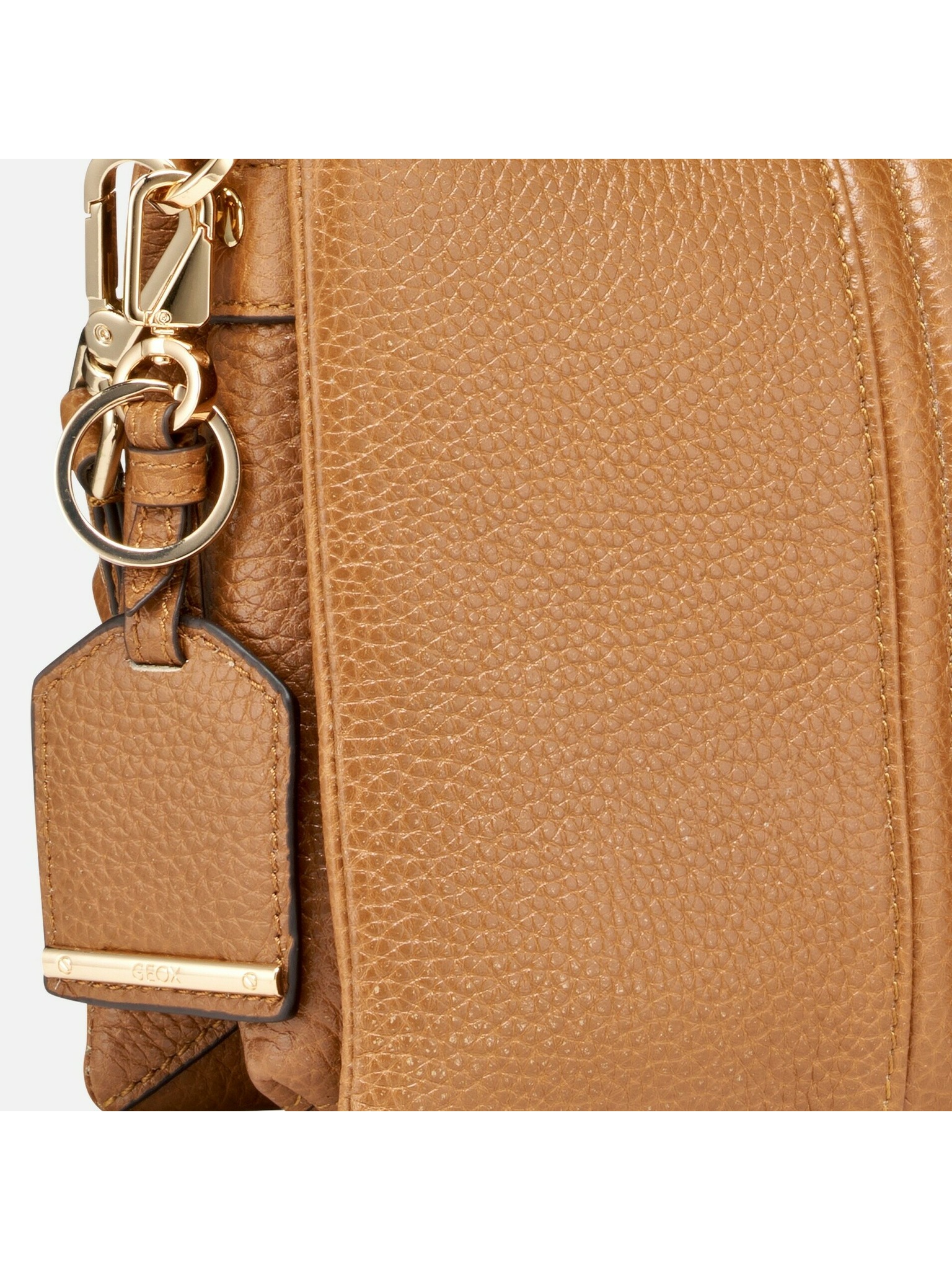 Táto kompaktná kabelka je navrhnutá na každodenné nosenie v meste. Vďaka rozmerom 22 × 19 × 7 cm ponúka prehľadný priestor na všetky nevyhnutnosti, pričom zapínanie na zips chráni obsah pred vypadnutím. Súčasťou je nastaviteľný a odnímateľný ramenný popruh na nosenie cez rameno alebo crossbody, doplnený o odnímateľnú kľúčenku. Cognac prevedenie z mäkkej valchovanej kože dopĺňajú kovové detaily vo svetlozlatom tóne.
