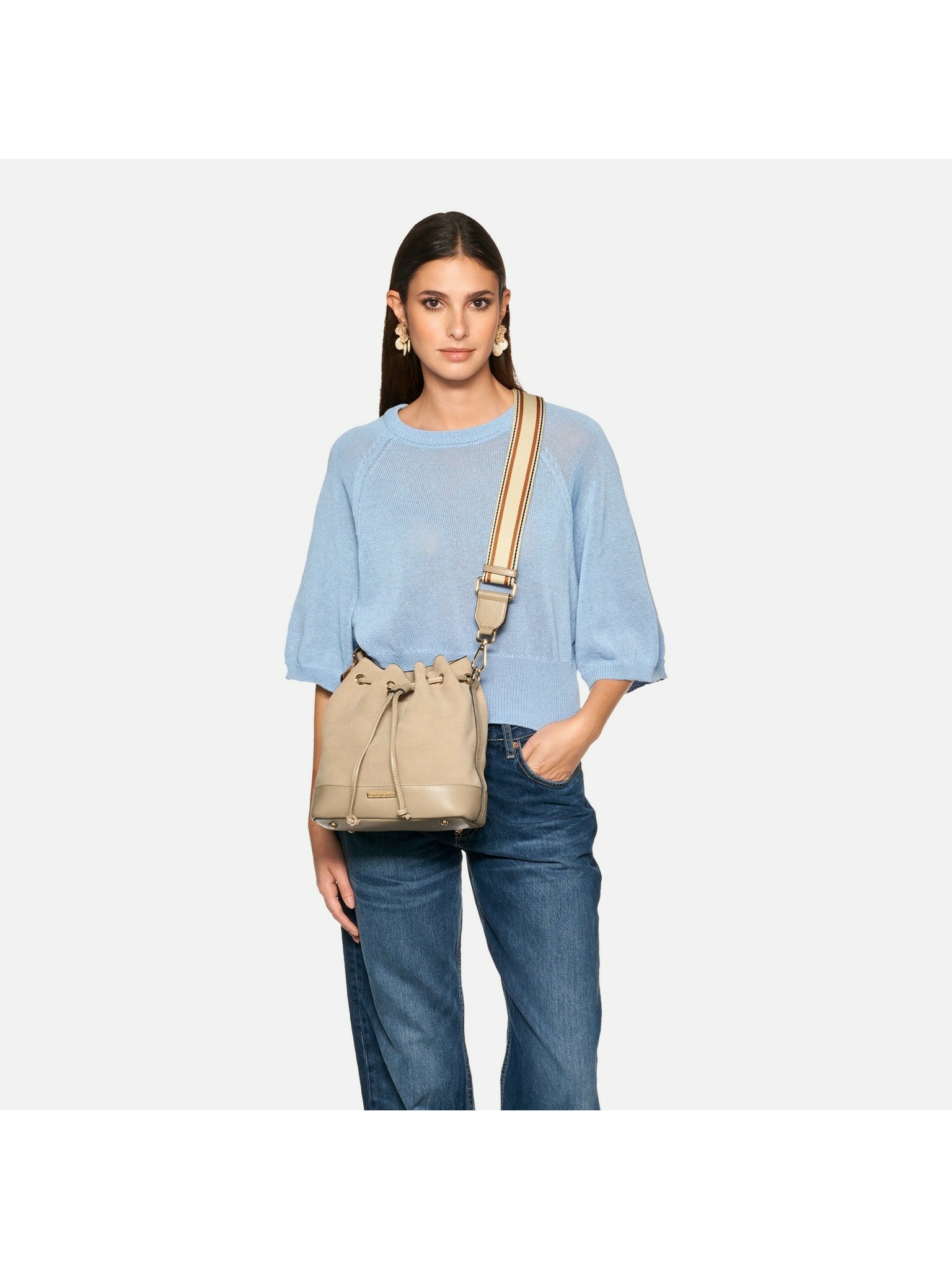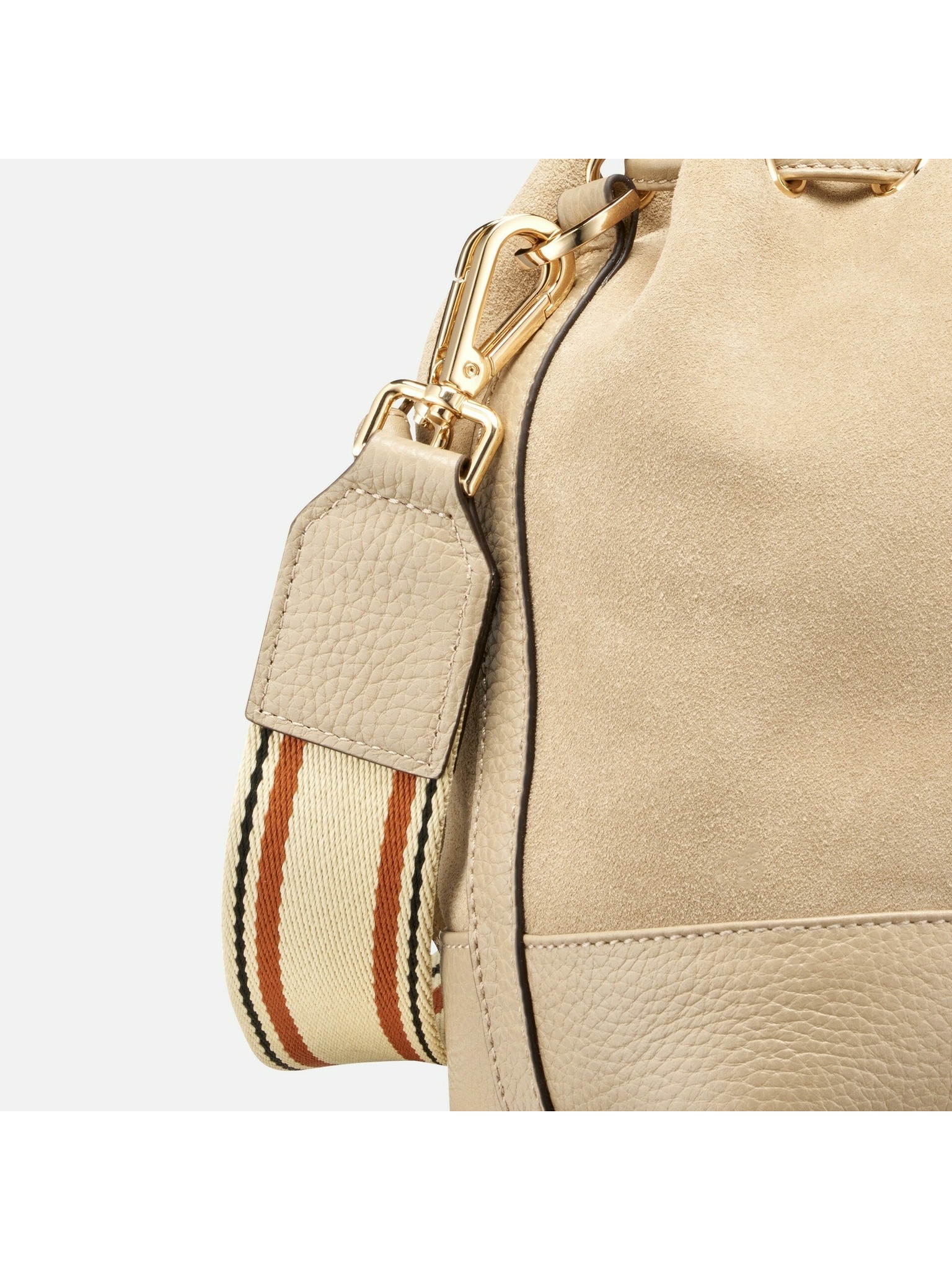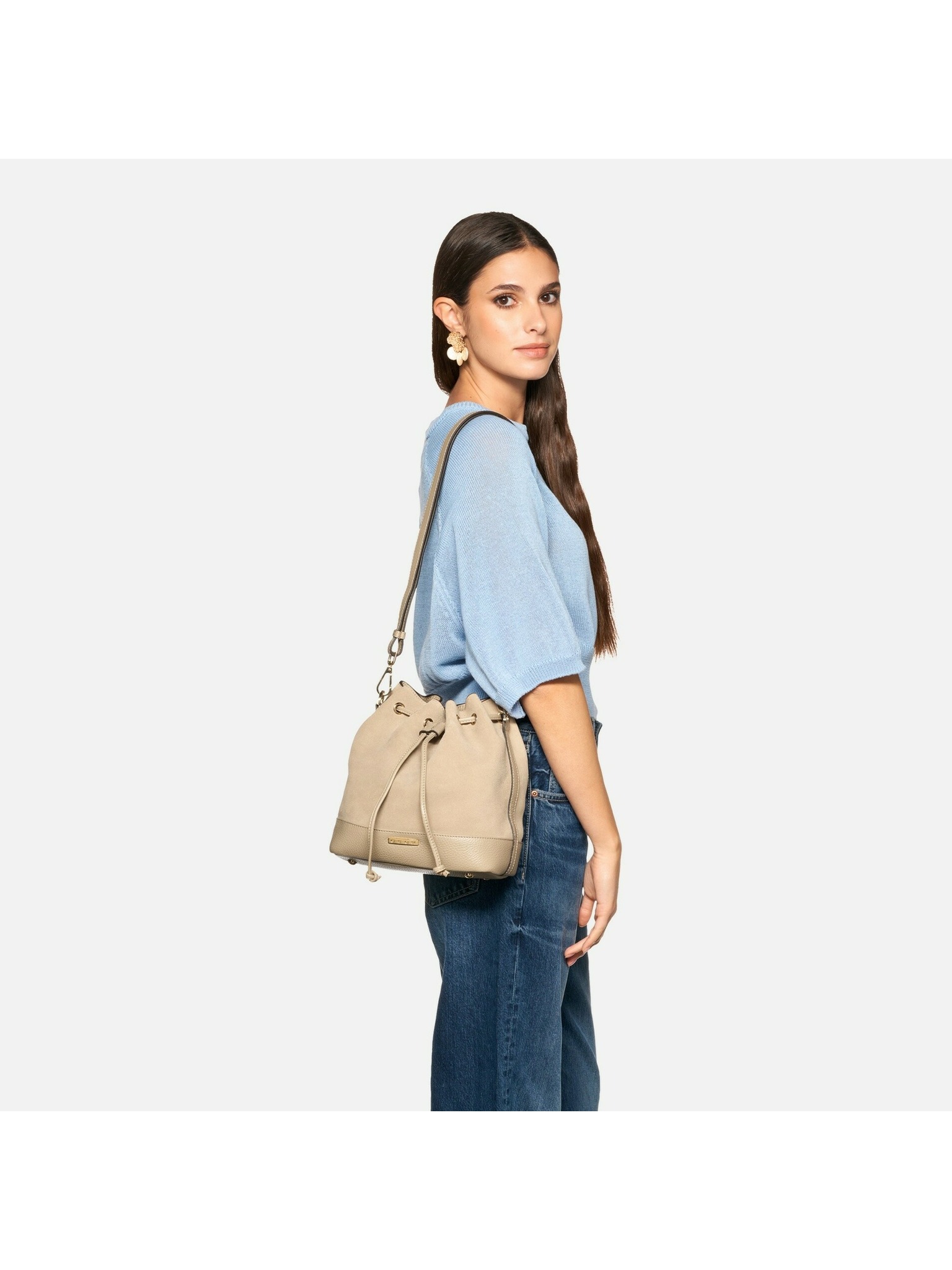 Tento model v jemnom svetlo taupe odtieni kombinuje mäkkú zrnistú kožu so semišom a ponúka funkčné riešenie pre mestské dni. Kompaktný, no priestranný bucket tvar zabezpečuje komfort aj štýl pri každodennom nosení.