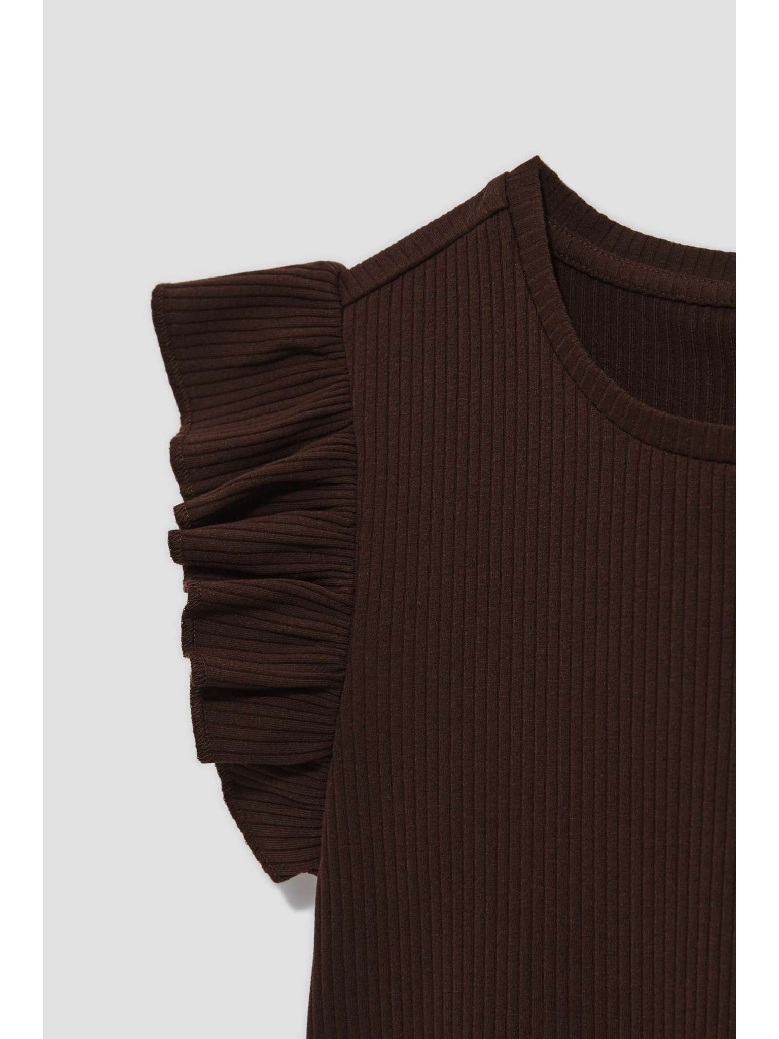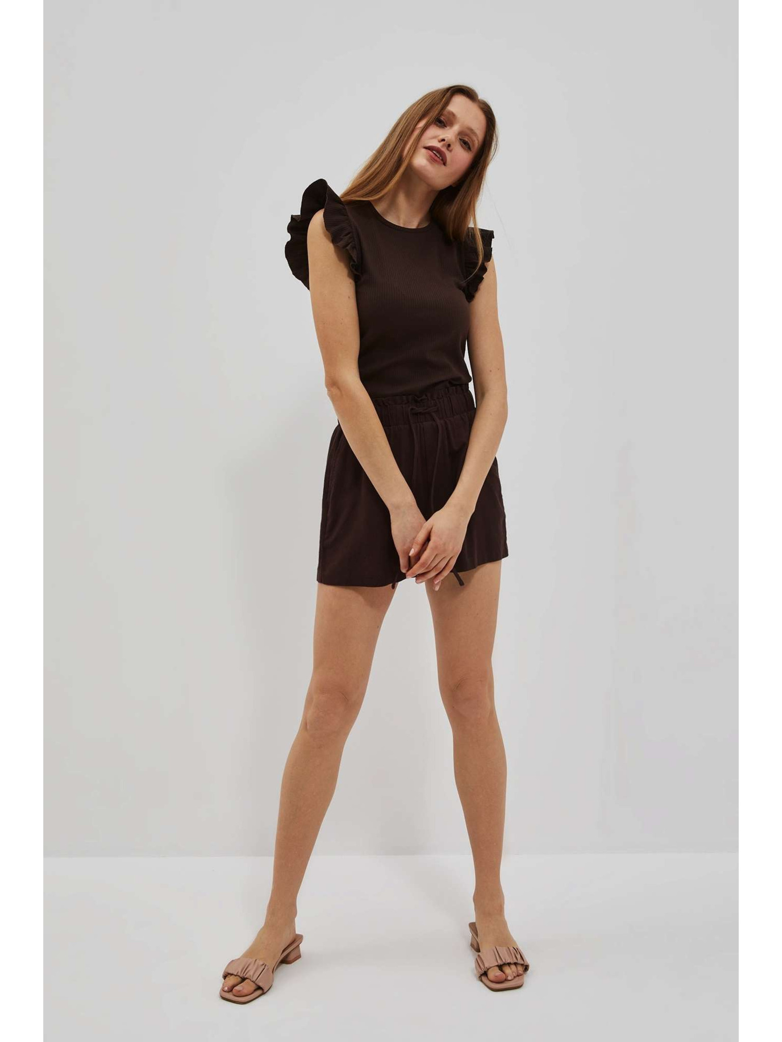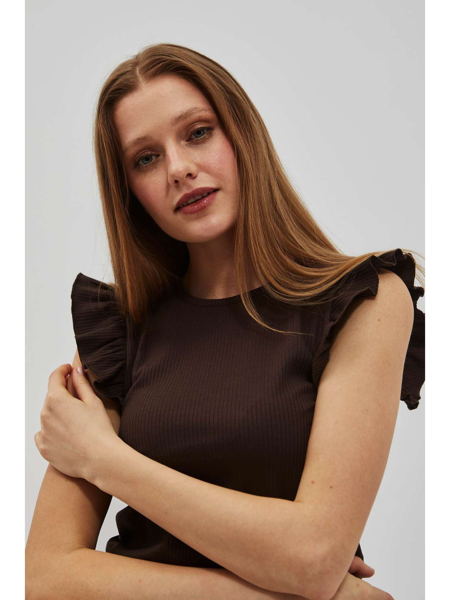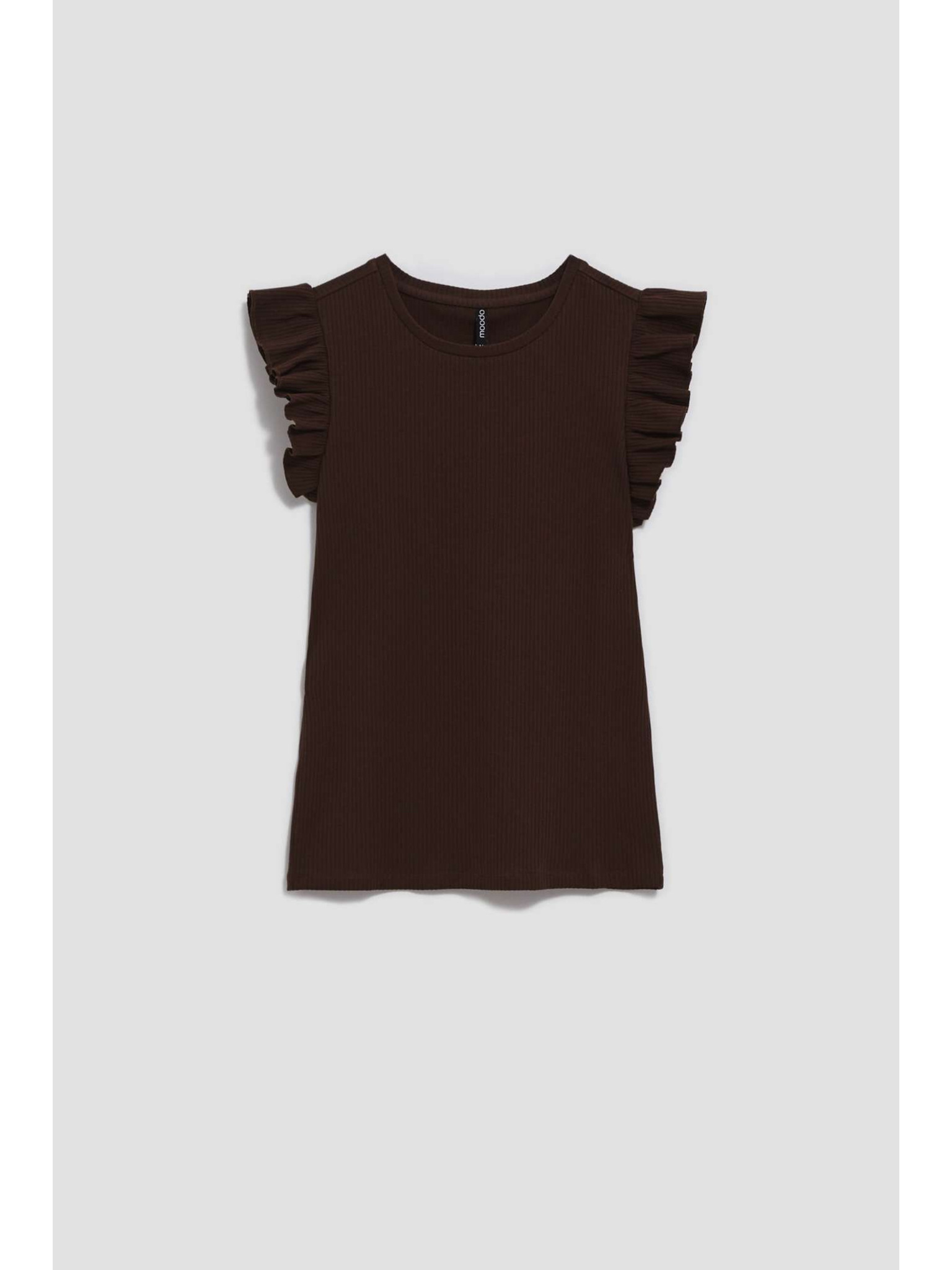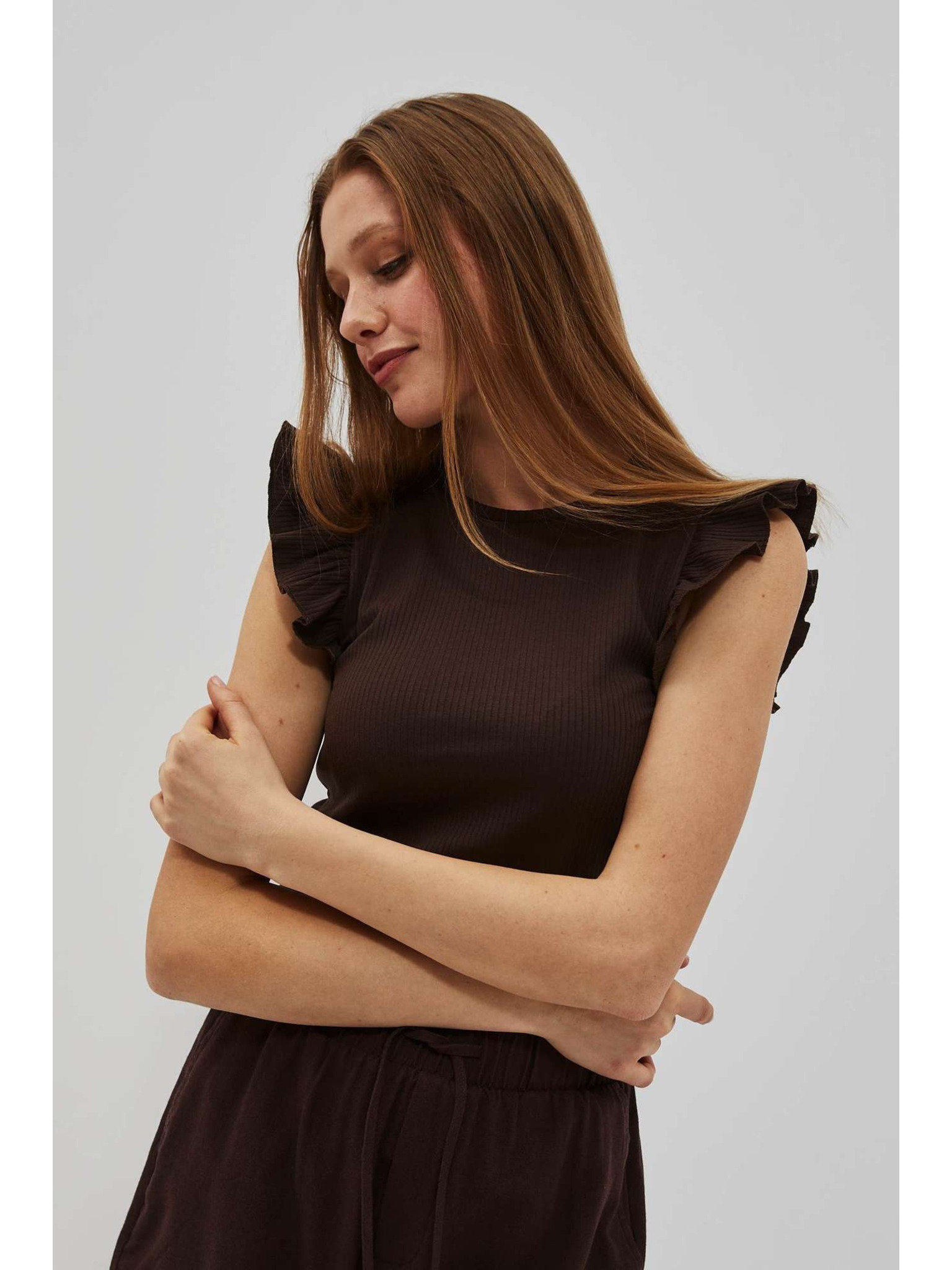 Tmavo hnedá blúzka s volánmi na ramenách Moodo