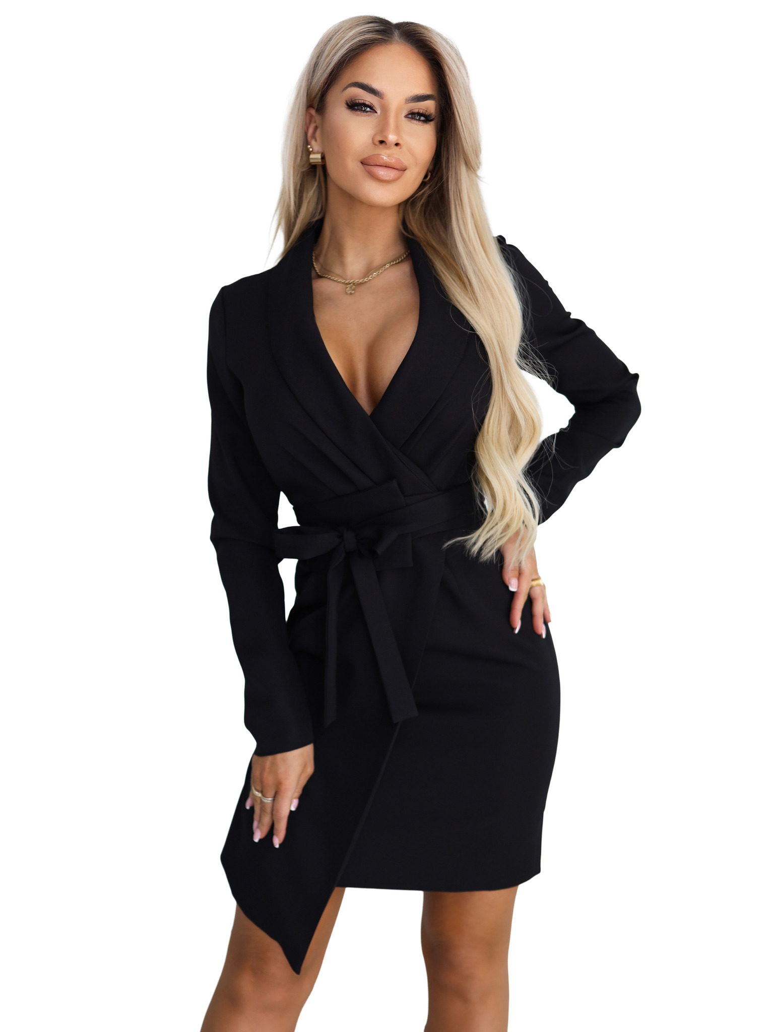 Elegantné sakové šaty s páskom a asymetrickým lemom - čierne