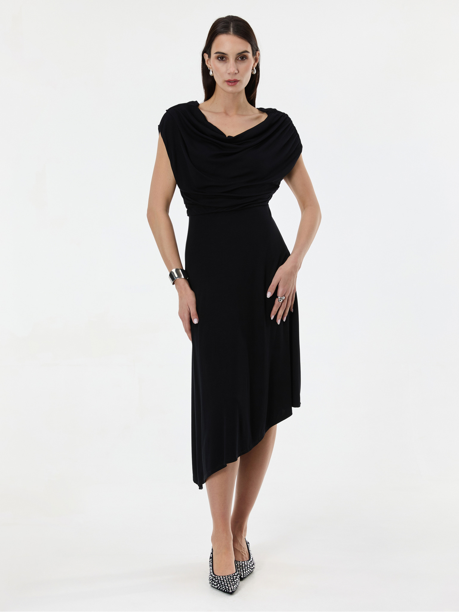Trblietavé dlhé šaty so srdiečkovým výstrihom - čierne Numoco CRYSTAL