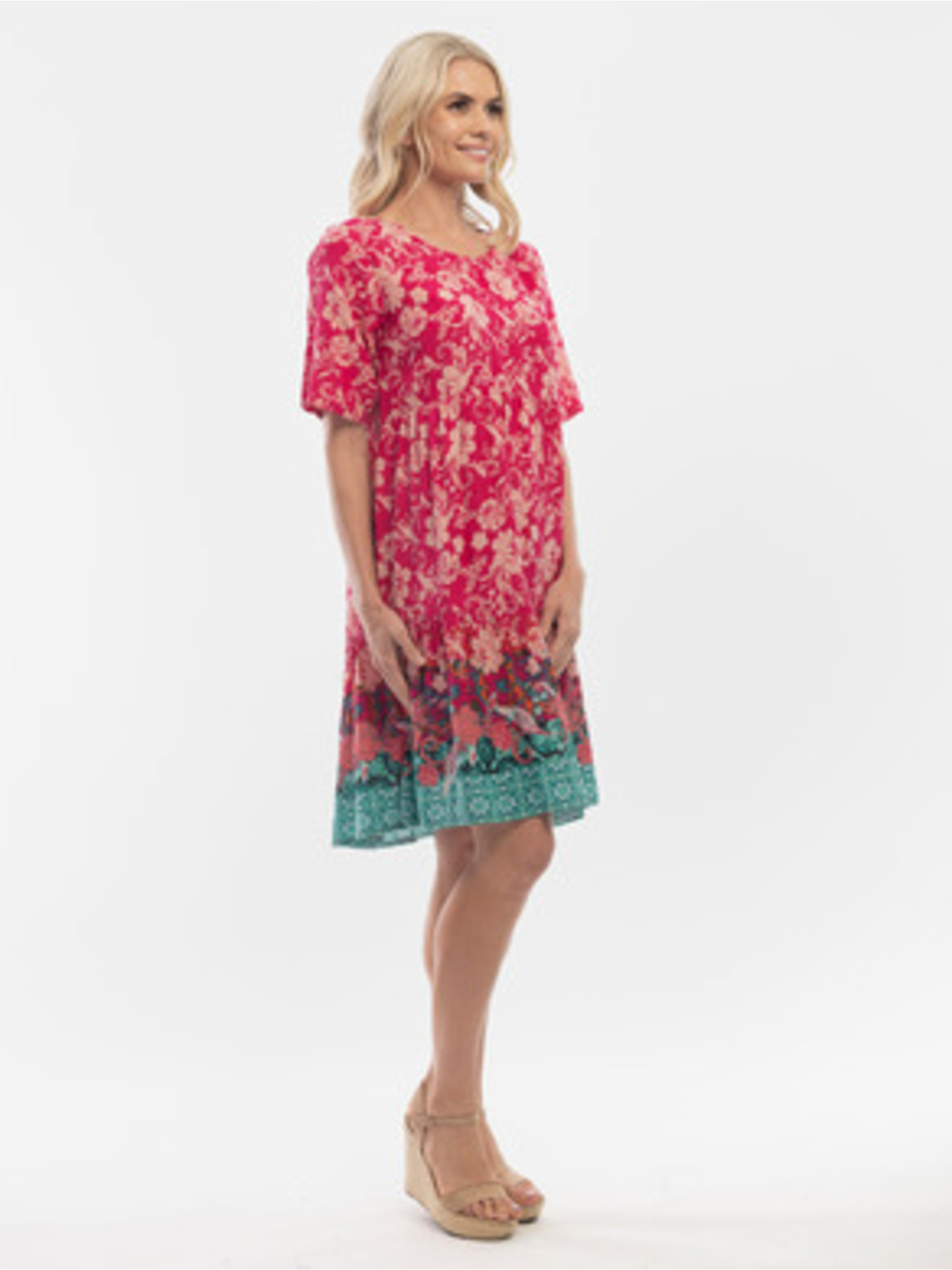 Šaty s dlhším zadným dielom, výstrihom a opaskom - ružové kvety Numoco MAYA