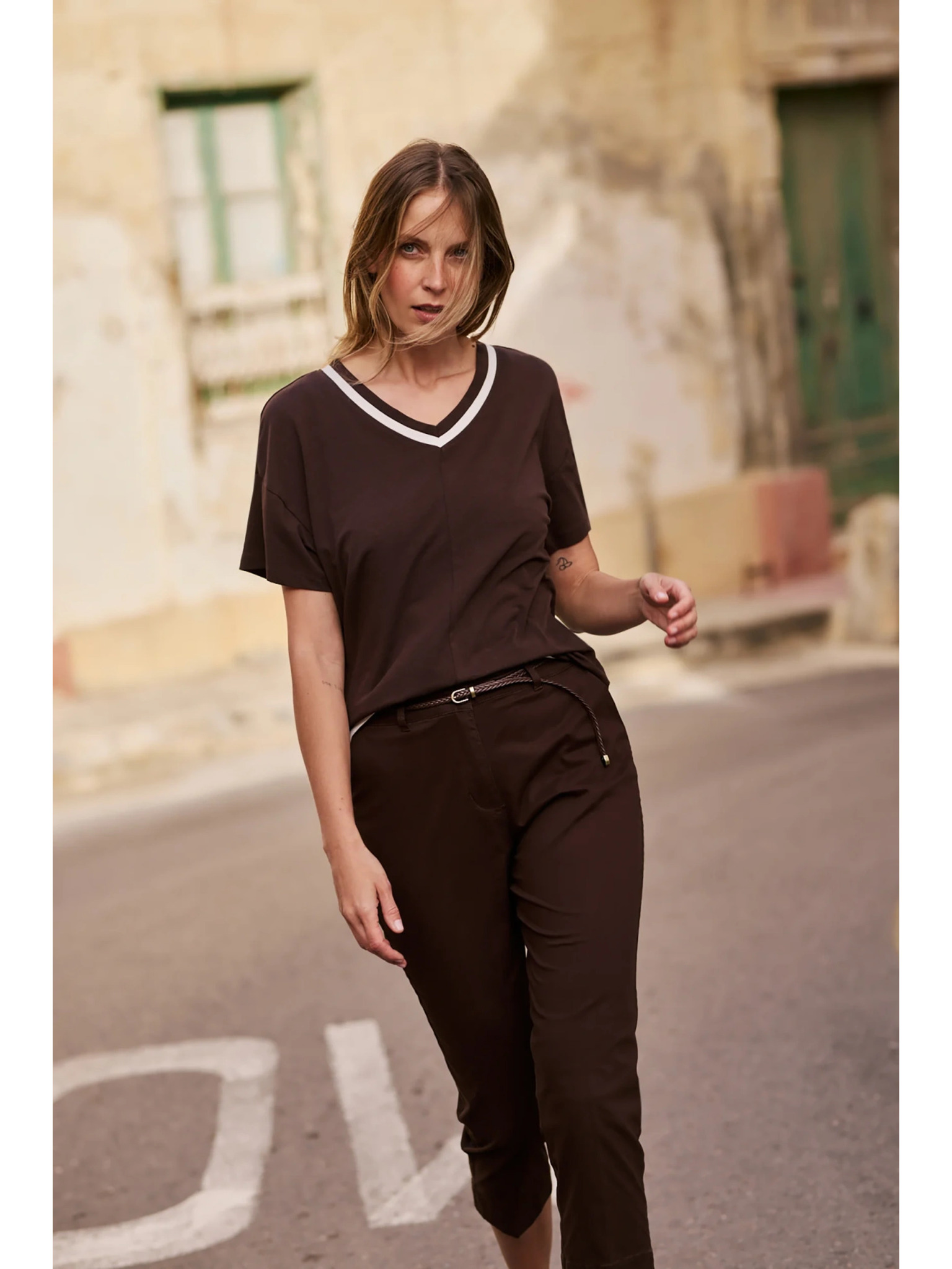 Bavlnené tričko s výstrihom do "V" hnedé Moodo