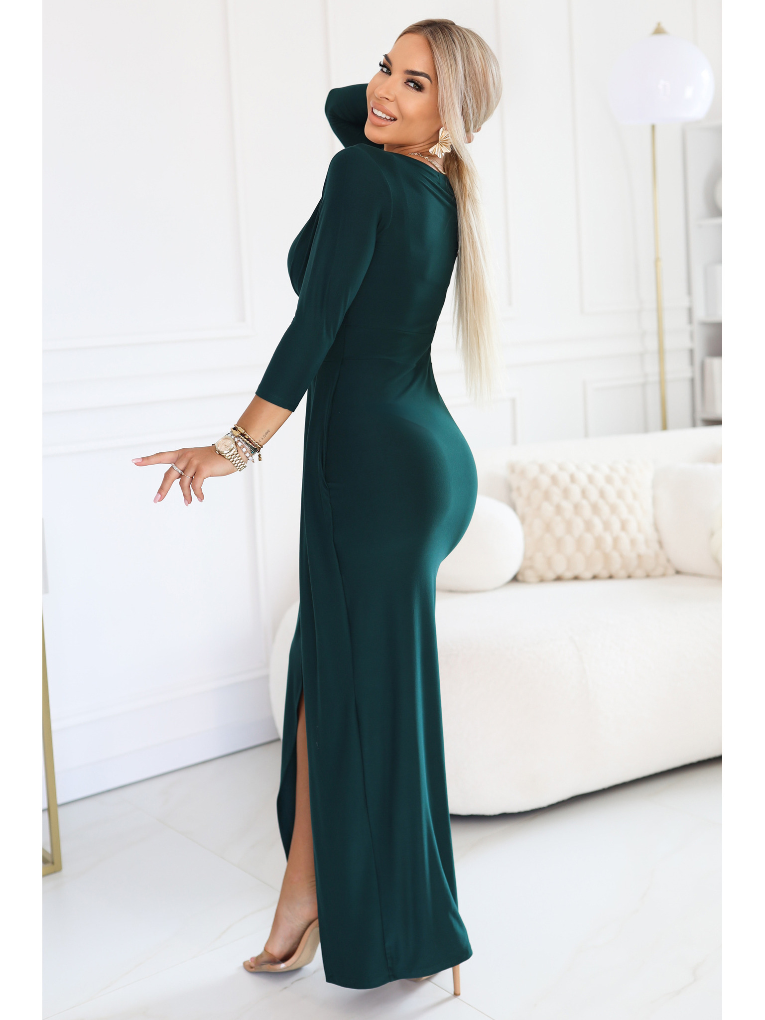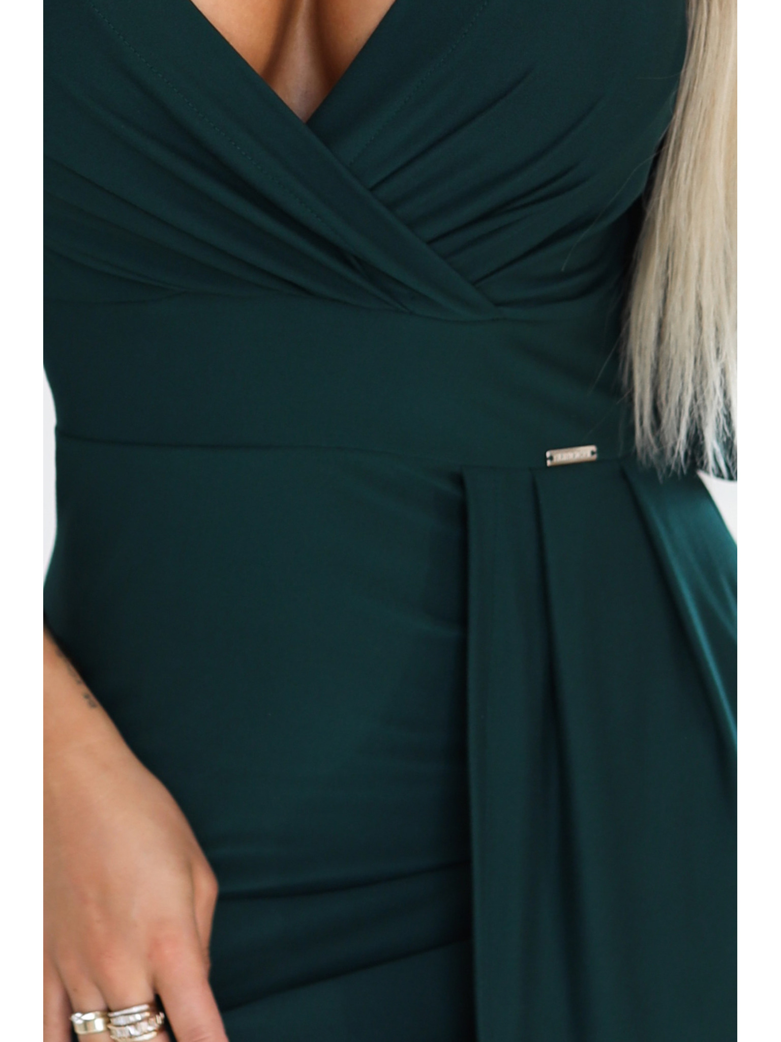 AURELIA dlhé šaty s rozparkom na nohavici a diamantovým výstrihom - fľaškovo zelené