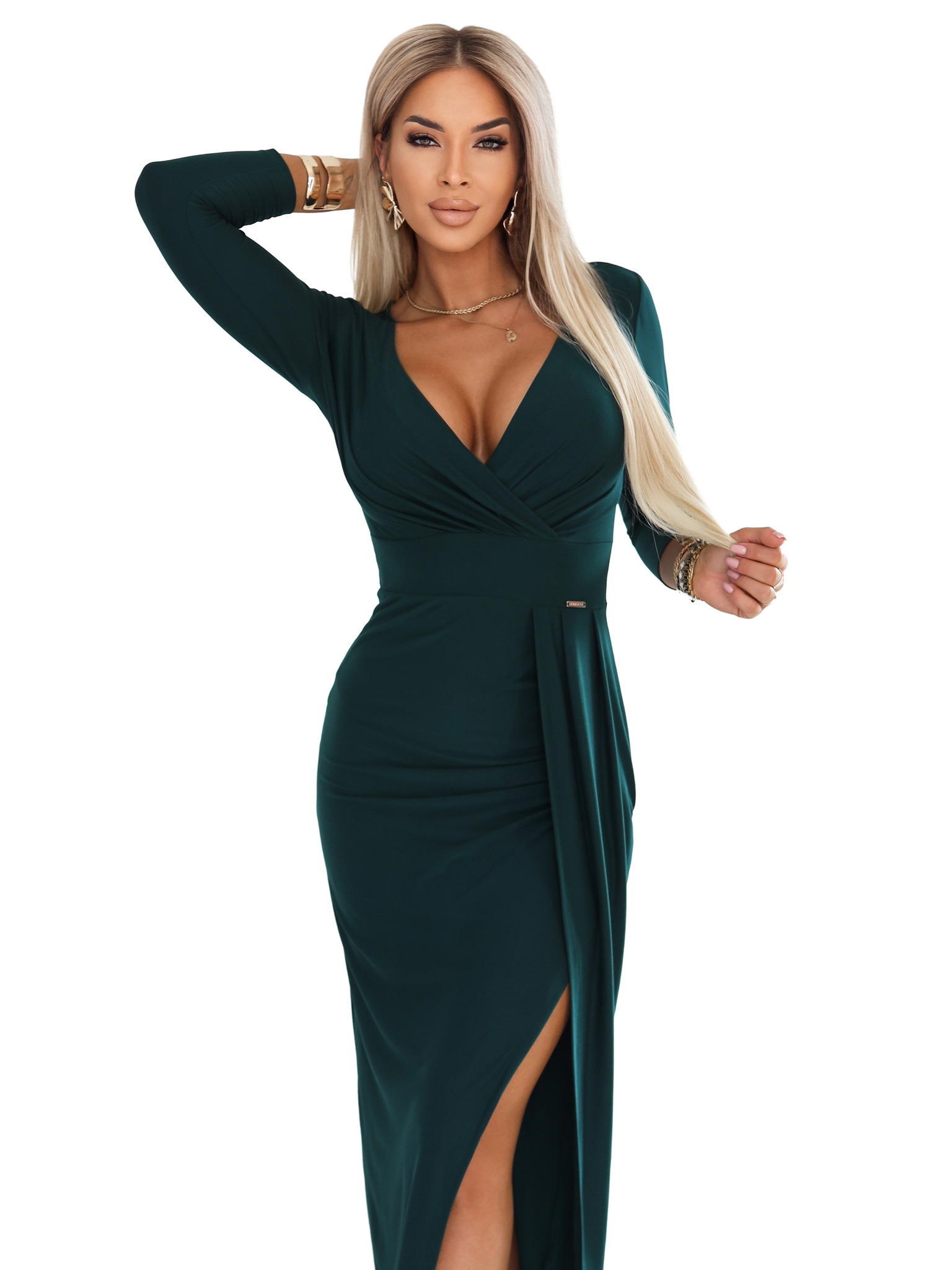 IRINA Oslňujúce dlhé šaty s brokátom, výstrihom do V a rozparkom na nohavici - fľaštickovo zelené