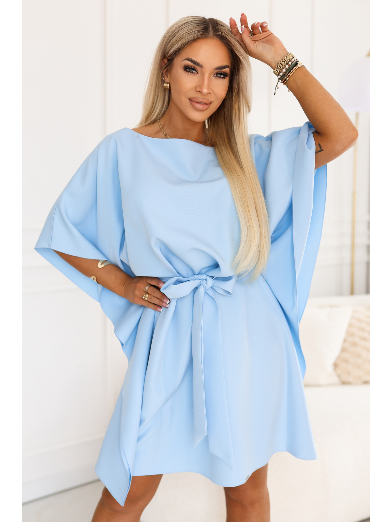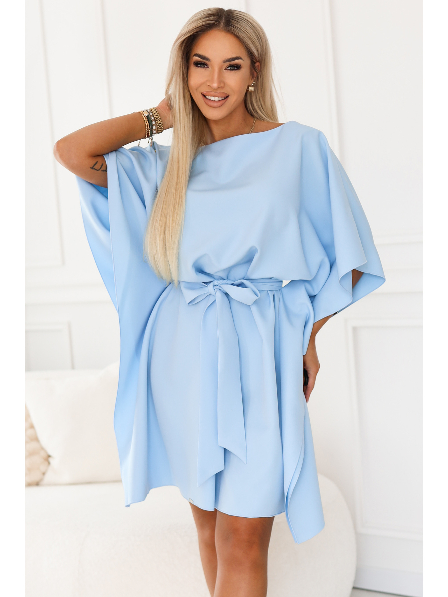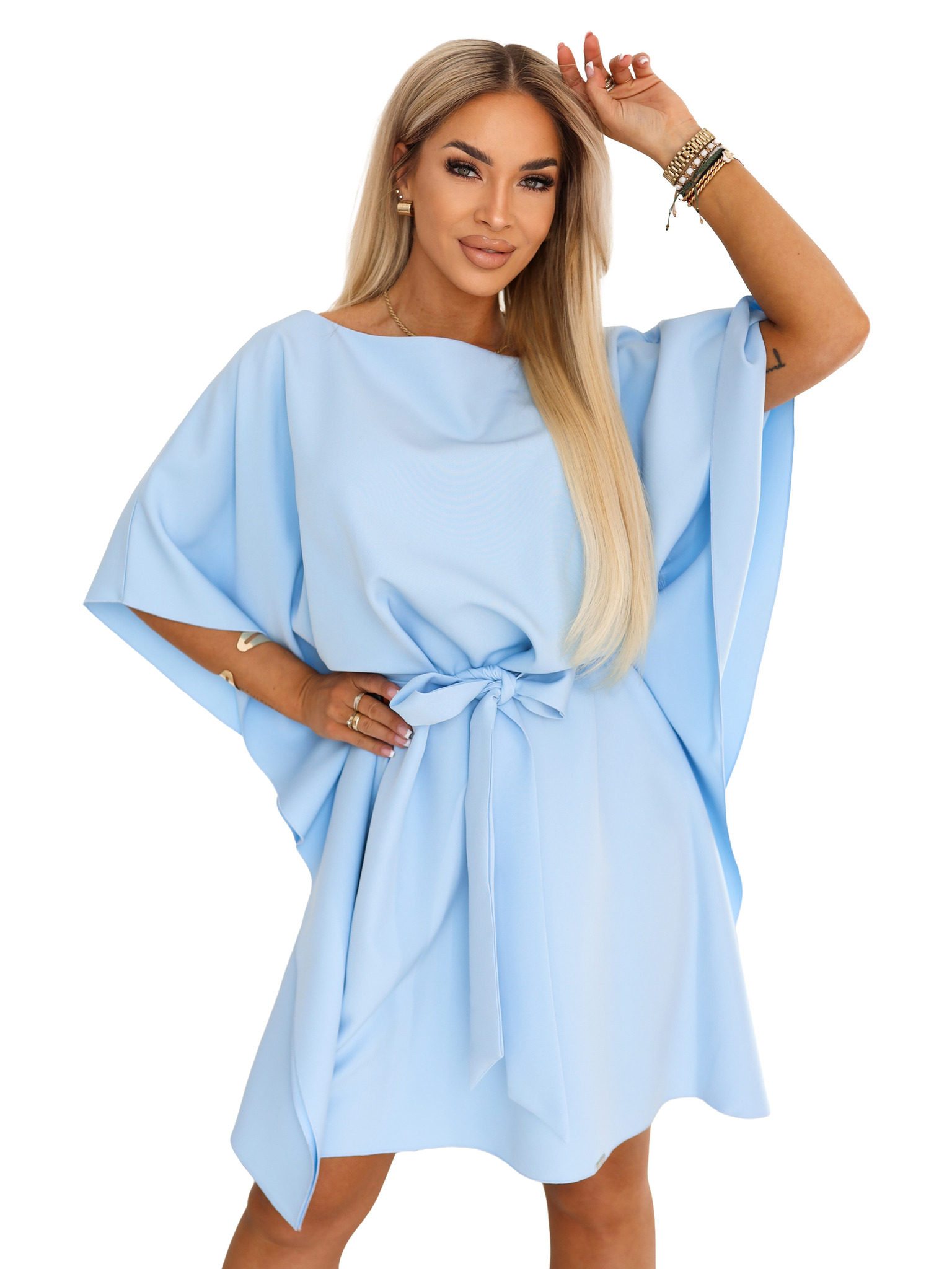 LORETTA Jedinečné dlhé šaty s tylový rukávmi a výstrihom - svetlo modré