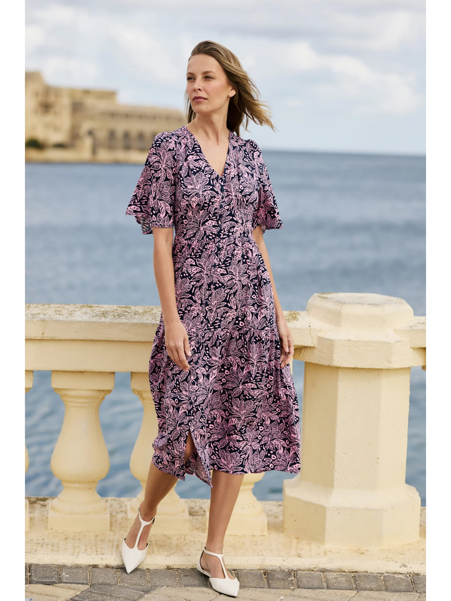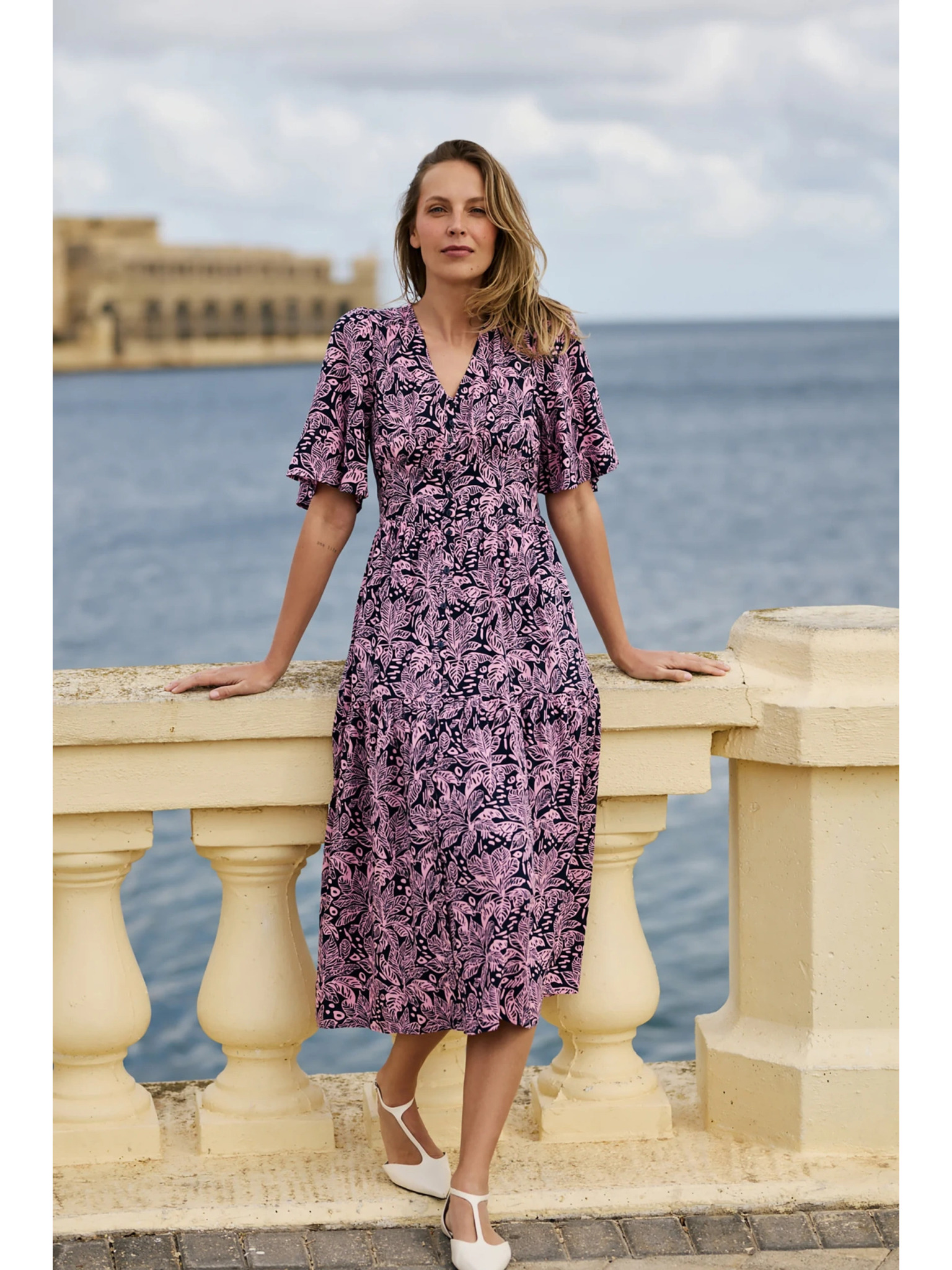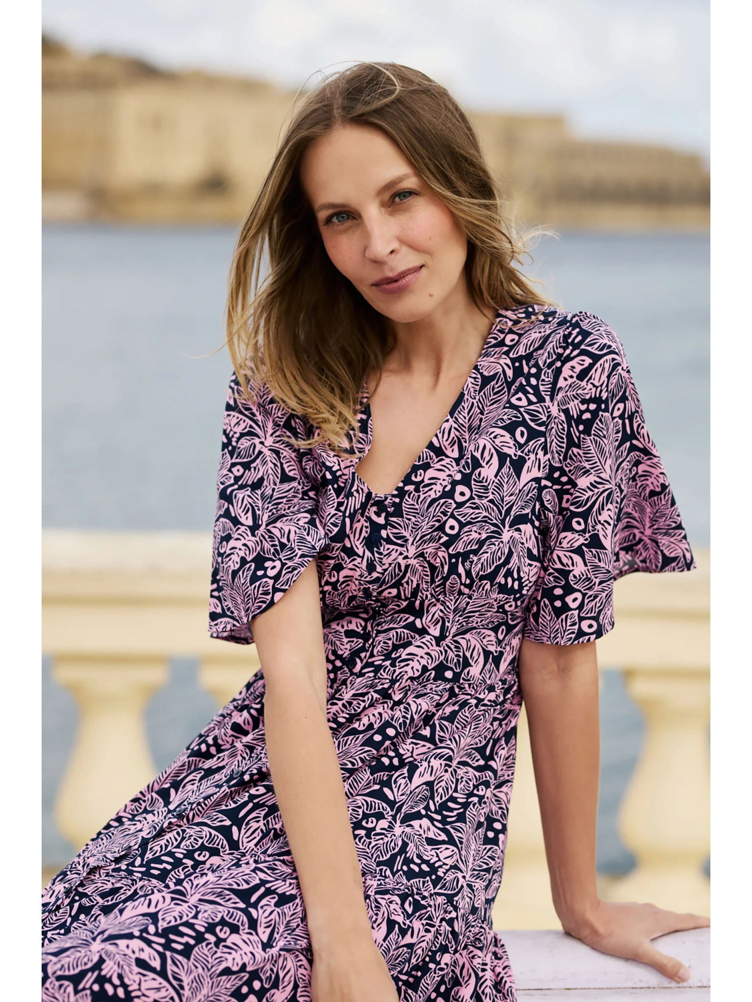 296-13 VICTORIA Boho šaty s trapézovým vzorom a stredomorskou potlačou