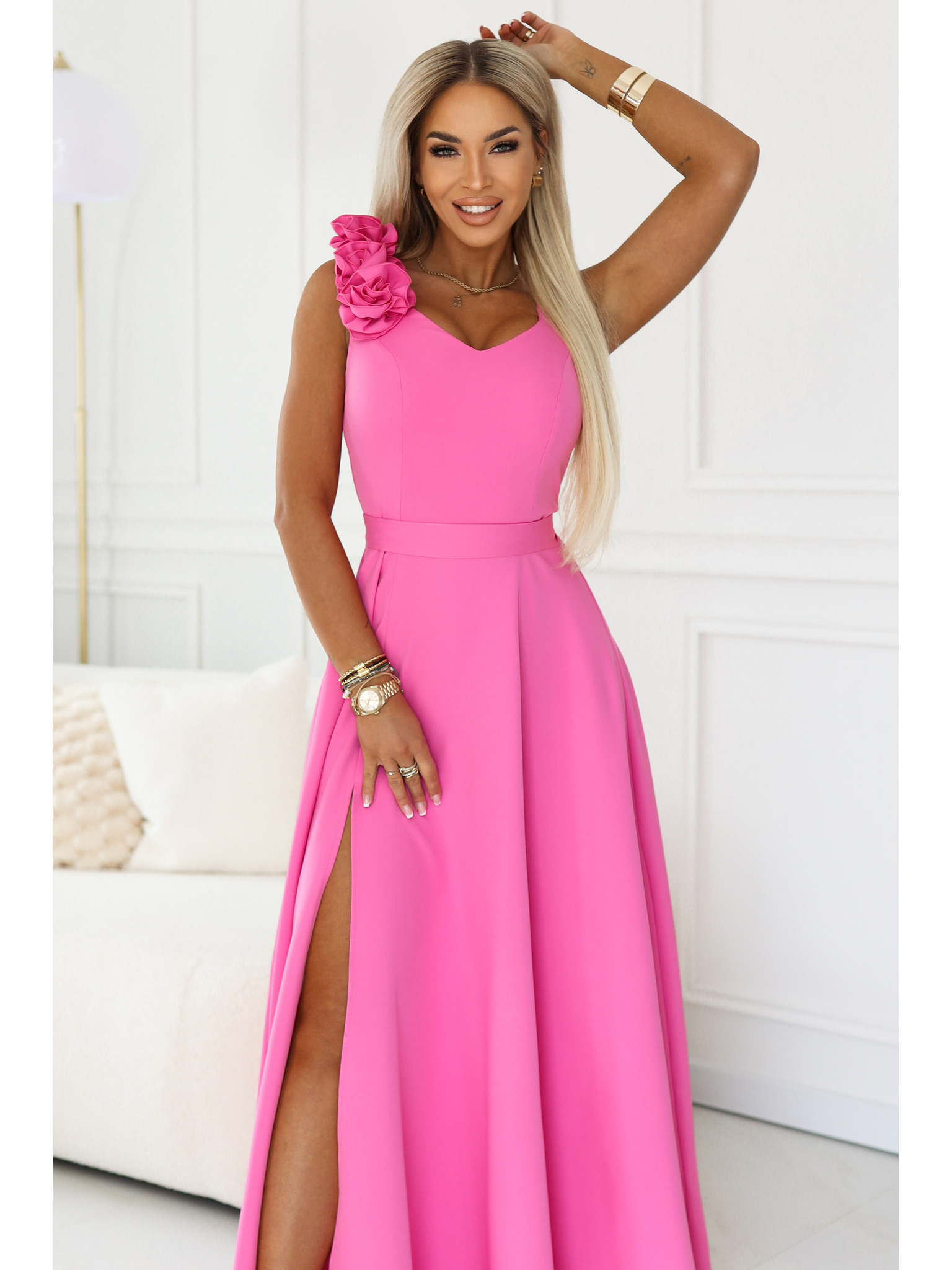 Elegantné maxi večerné šaty s rozparkom a ružami - klasická čierna