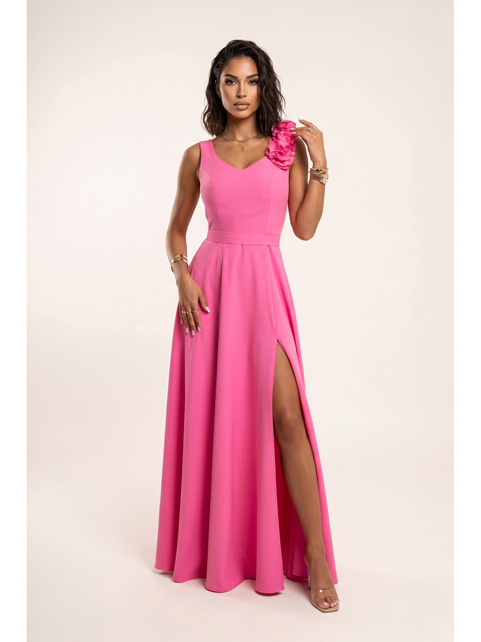 Elegantné dlhé spoločenské šaty s kvetinou, páskom a vysokým rozparkom - fľaškovo zelená