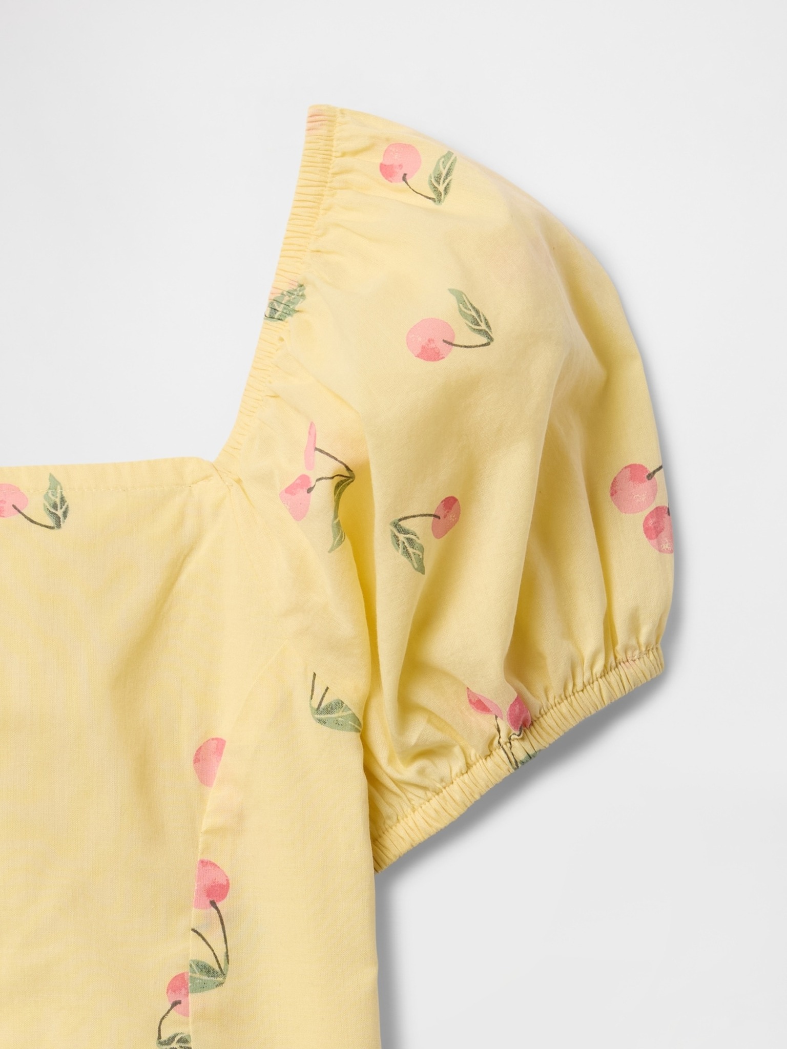 • Detský top z hladkej tkaniny s krátkymi nariasenými rukávmi, ktoré majú elastické zakončenie aj ramennú časť pre pohodlné nosenie.