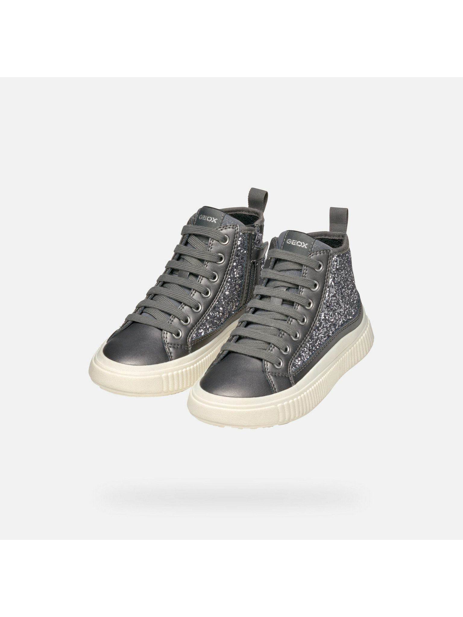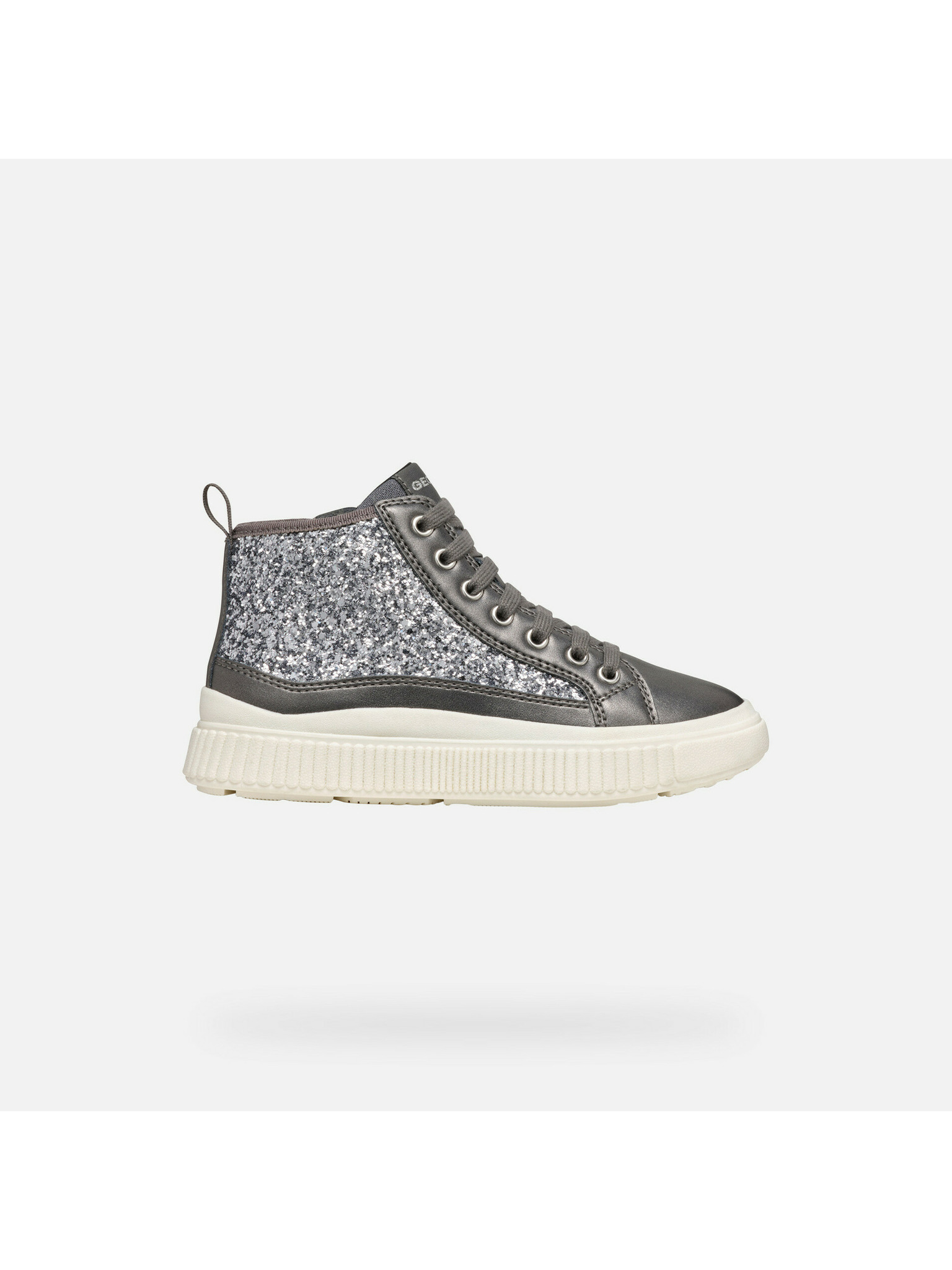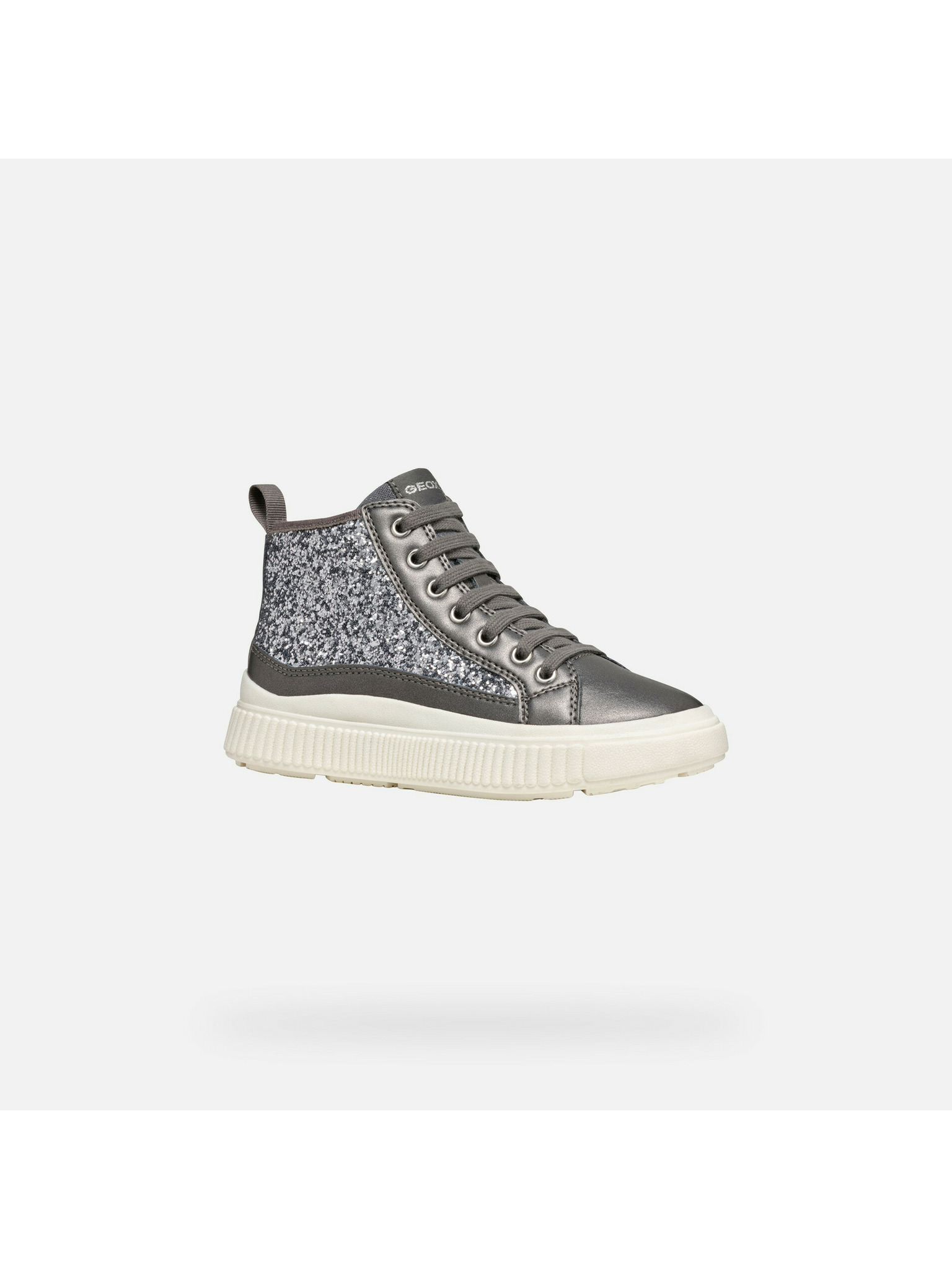 Strieborná dievčenská kotníková obuv Geox Laquinny Girl s trblietavými detailmi na šnurovanie pre školné dni a mestské prechádzky.