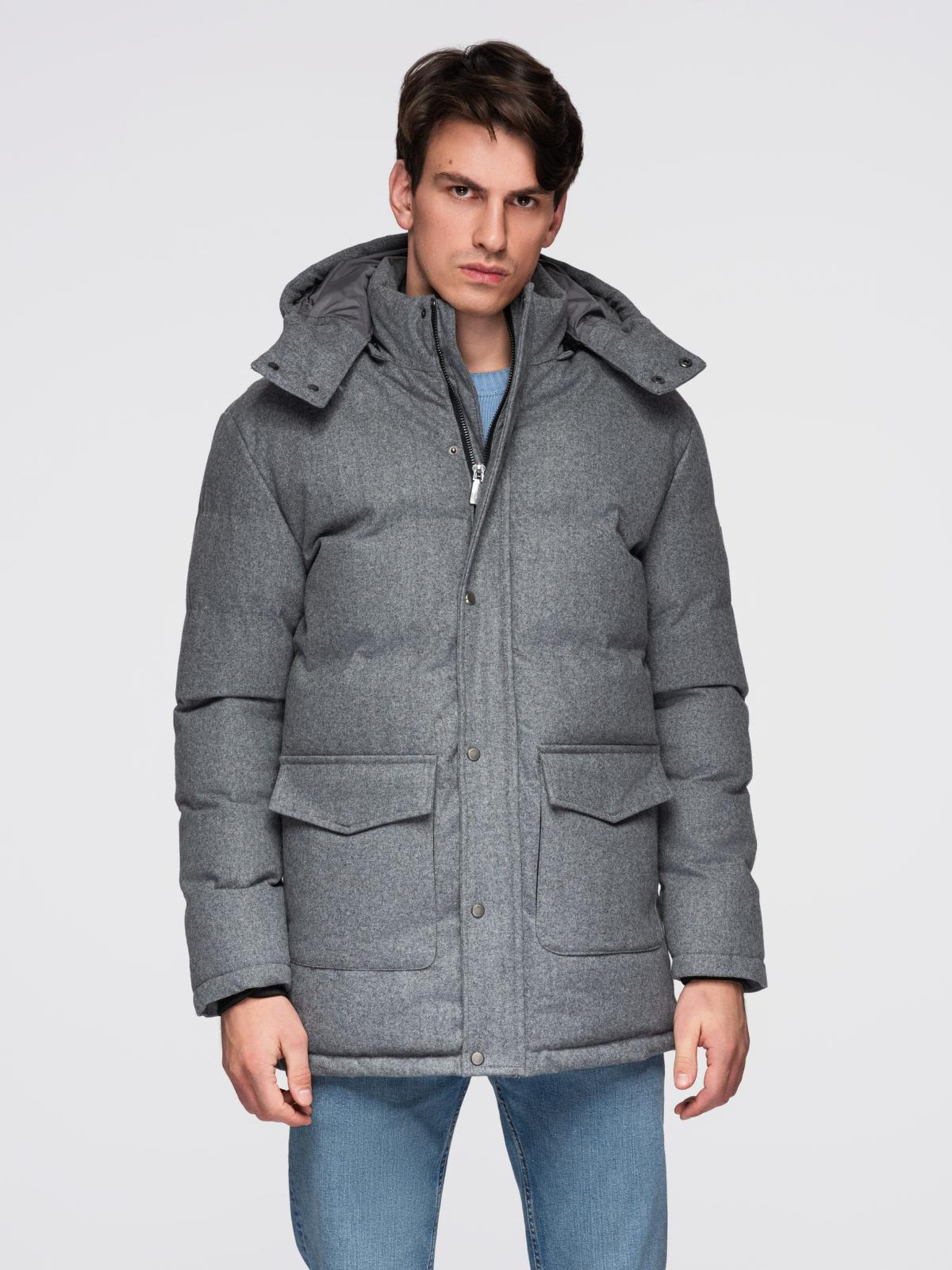 Pánska bunda parka s vysokým golierom a asymetrickým zapínaním sivá Ombre Oblečenie