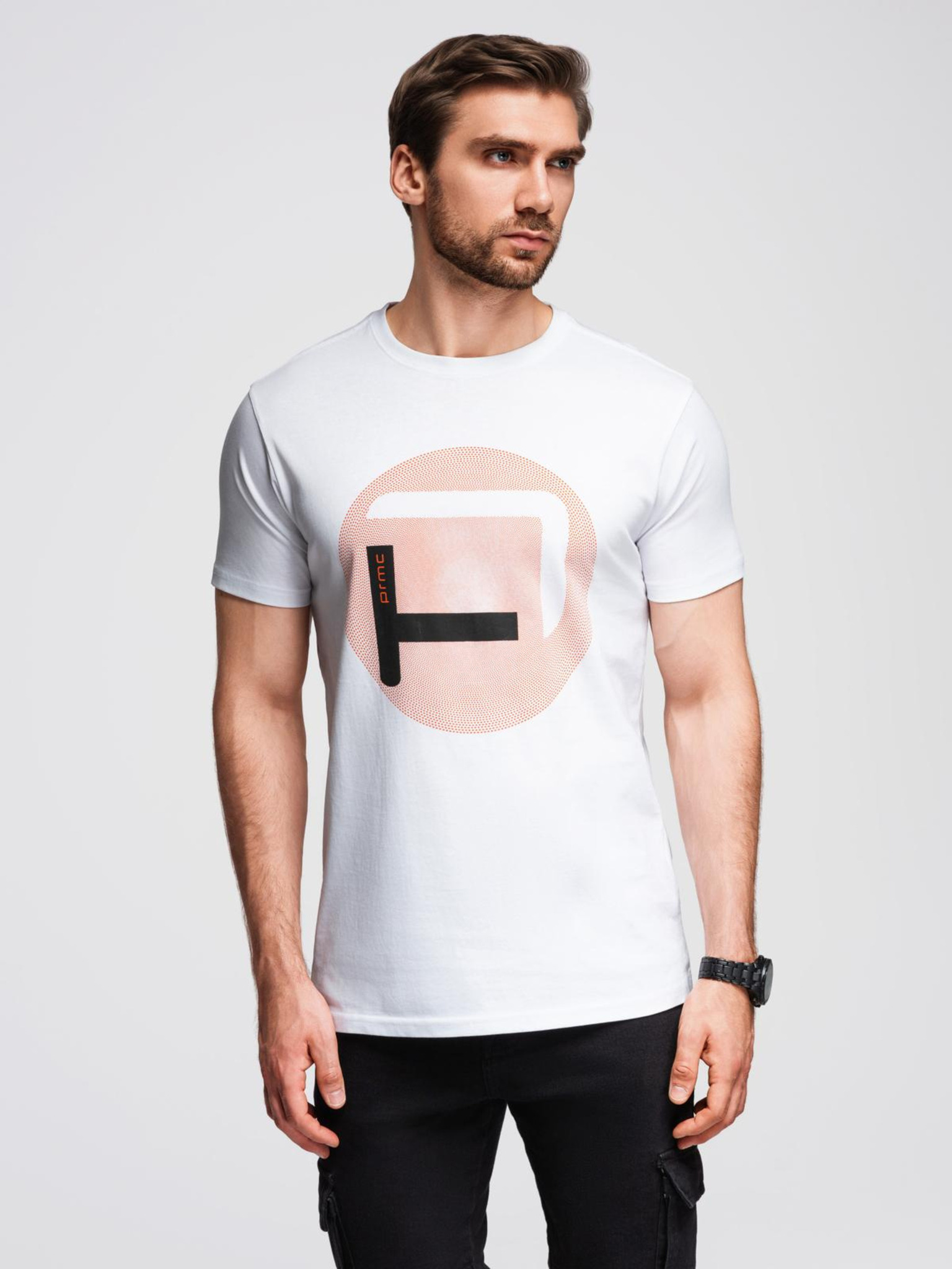 Pánske bavlnené tričko s geometrickou potlačou - biele V2 OM-TSPT-0260 Ombre Clothing