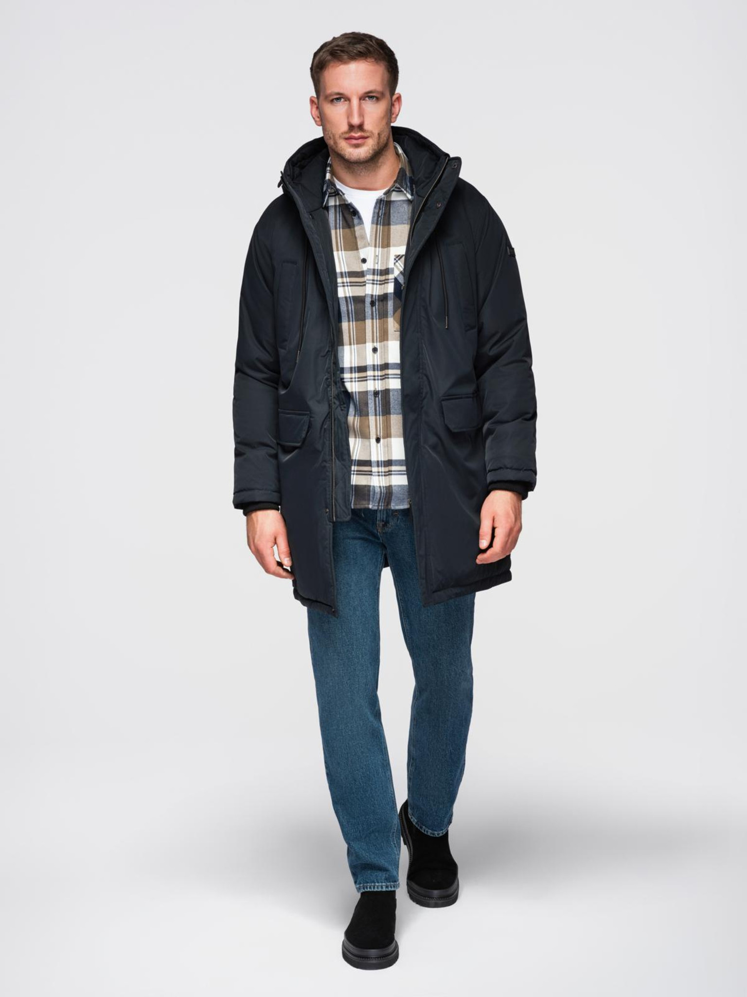 Elegantná pánska parka s vreckami a kapucňou - tmavo modrá V2 OM-JAPJ-0287 Ombre Clothing