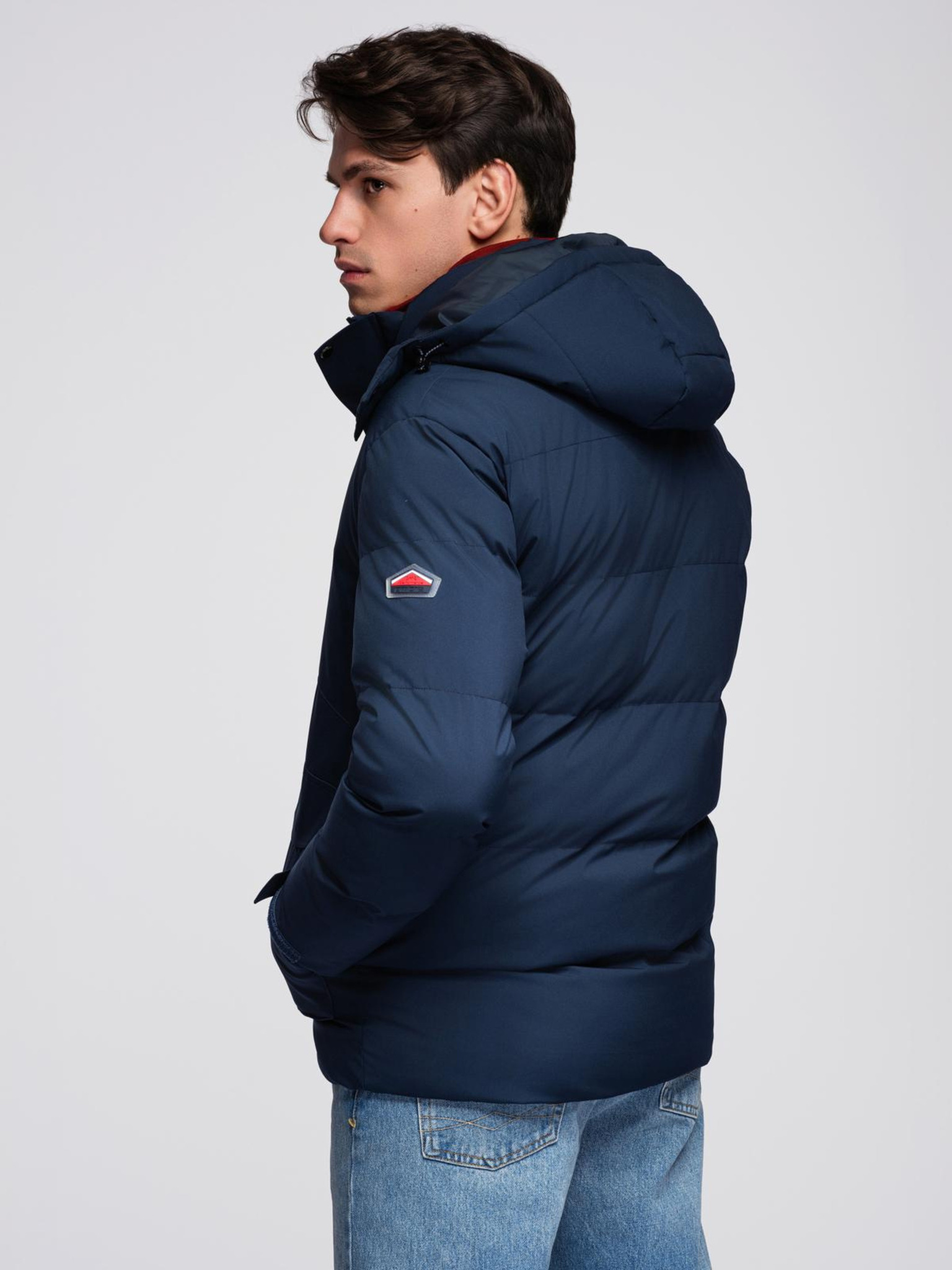 Pánska prešívaná bunda s kapucňou - tmavo modrá V4 OM-JAHP-0235 Ombre Clothing